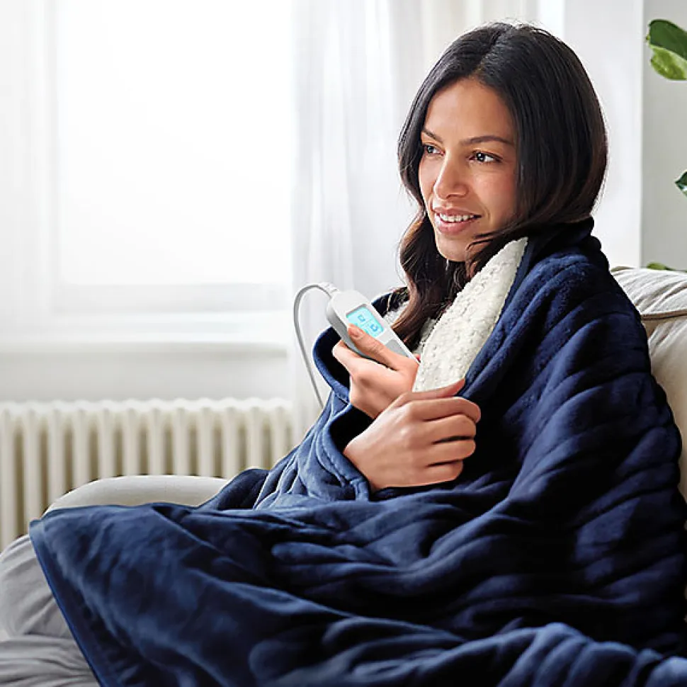 Envie d’être bien au chaud et confortable chez vous, sans avoir à allumer le chauffage central ? Notre plaid chauffant électrique en polaire & sherpa vous gardera bien au chaud lors des soirées fraîches.Grâce à son design réversible, vous pouvez choisir entre une face en microfibre polaire ultra-douce et une face en sherpa moelleux, selon votre humeur et votre style intérieur.Le plaid dispose de 10 niveaux de température entièrement réglables, pour une flexibilité totale. Tous les réglages se contrôlent facilement via la télécommande intuitive, qui vous permet d’atteindre et de maintenir votre niveau de chaleur idéal. La télécommande et le câble sont détachables afin de permettre un lavage facile en machine.Un minuteur intégré de 10 heures, ainsi qu’une fonction d’arrêt automatique et de protection contre la surchauffe, le rendent parfait à utiliser sur le canapé ou pour s’endormir.Caractéristiques :Design réversible élégant : la microfibre polaire isolante et le sherpa moelleux vous gardent au chaud même lors des journées les plus froides.10 niveaux de chaleur : choisissez parmi 10 réglages pour un confort personnalisé.Minuteur intégré de 10 heures : avec arrêt automatique pour s’adapter à votre emploi du temps.100 % lavable en machine : il suffit de retirer la télécommande détachable et de mettre le plaid à basse température.Fonctions de sécurité : protection avancée contre la surchauffe qui éteint automatiquement le plaid en cas de danger, pour une tranquillité d’esprit.Poids : 1,7 kgConsommation d’énergie : 0,11-0,12 kWhTempérature maximale : 50°C