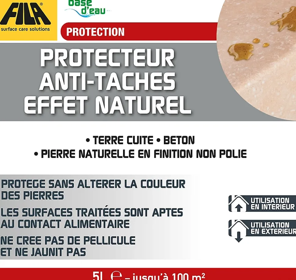 - Protège contre les salissures huileuses les matériaux absorbants tels que la pierre naturelle brute, la terre cuite et le béton