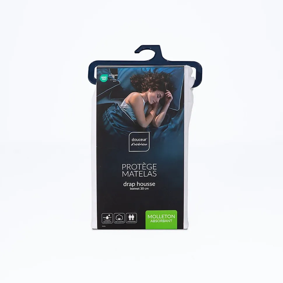 Offrez à votre matelas une bonne protection avec le protège matelas >. Composé de coton gratté de 200 gr/m², il absorbera la moindre goutte d’humidité…et est facile à mettre en place grâce à ses bords élastiqués !CARACTERISTIQUES :Dimensions : 160×200 cmMatière : Coton gratté de 200 gr/m²Couleur : BlancBonnet : 30 cmFabrication : EspagnePOINTS FORTS :Hygiène et bien-être : Le coton gratté ne retient pas l’humidité due à la transpiration corporelle pour une surface sèche et confortable tout au long de la nuit.Facile d’utilisation : Les bords sont élastiqués pour une installation facile et un bon maintien du protège matelas.ENTRETIEN :Lavage en machine à 40°C.