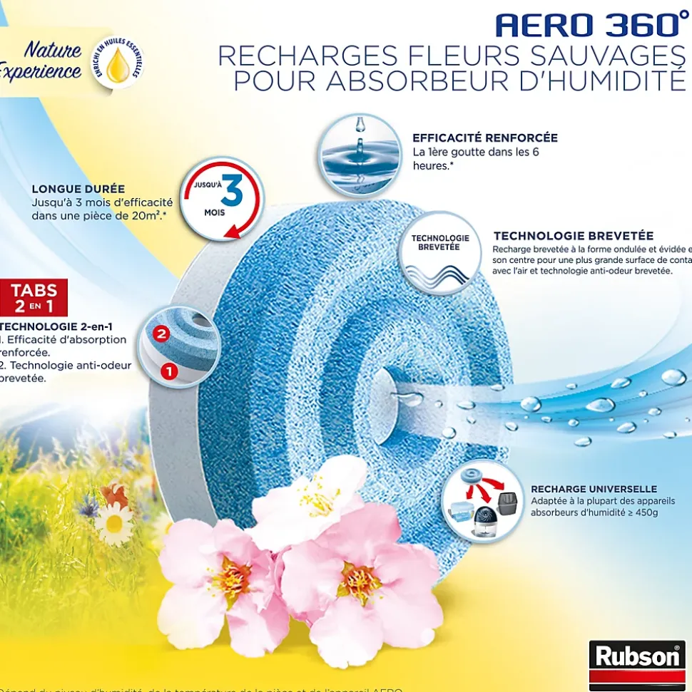 Contrôle de l’humidité & des odeurs – L’absorbeur AERO 360° et ses recharges sont idéaux pour absorber efficacement l’humidité et neutraliser les mauvaises odeurs. Parfum agréable – Agit comme destructeur d’odeurs mais diffuse aussi un parfum délicat de fleurs sauvages aux notes de vanille, musc et jasmin. Formule enrichie en huiles essentielles. Longue durée – Une seule recharge Rubson est idéale pour les pièces jusqu’à 20 m² et dure jusqu’à 3 mois tout en diffusant un parfum de fleurs sauvages. Utilisation universelle – La recharge pour déshumidificateur Rubson AERO 360° s’adapte facilement à presque tous les absorbeurs d’humidité rechargeables de 450 g et plus. Luttez efficacement contre l’humidité tout en profitant d’un agréable parfum de vanille, musc et jasmin avec les tablettes RUBSON Nature Expérience « Fleurs Sauvages » Dotées d’une technologie innovante 3 en 1, les recharges AERO 360° Nature Experience permettent non seulement de réduire l’excès d’humidité, mais aussi de neutraliser les odeurs et de créer une ambiance relaxante à la maison grâce à leur parfum naturel, gourmand et floral de vanille, musc et jasmin. Leurs cristaux actifs ultra absorbants et des agents anti-odeurs aident à prévenir les problèmes d’humidité courants comme la condensation, les moisissures et les mauvaises odeurs dans la maison. Leur délicat parfum de fleurs sauvages obtenu par des huiles essentielles vous offrira une expérience sensorielle unique et vous procurera une sensation de calme et de sérénité. Les tablettes ultra-absorbantes sont parfaites pour recharger votre absorbeur d’humidité AERO 360° afin d’assurer un contrôle durable et efficace de l’humidité ! Ces recharges sont compatibles avec la plupart des absorbeurs d’humidité de 450 g ou plus.Ingredient/Composition:Agents déshumidificateurs : chlorure de calcium