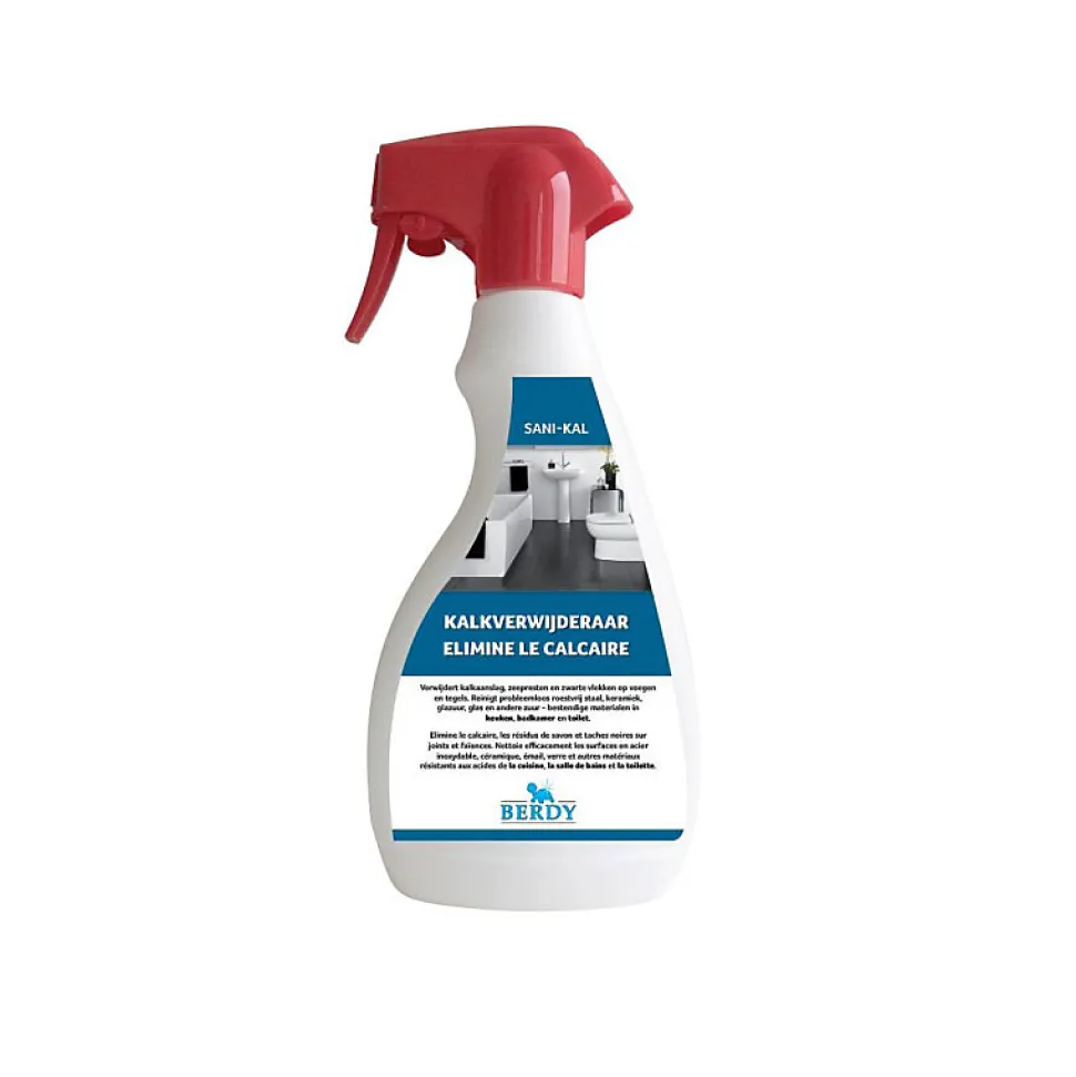 Sani-Kal – Anticalcaire – BerdyCe produit anticalcaire élimine sans aucun effort les dépôts calcaires tenaces des matériaux résistants aux acides, approprié pour la cuisine et salle de bains.Sani-kal est un détartrant avancé spécialement conçu pour éliminer sans effort les dépôts de tartre, les résidus de savon et les taches noires sur les matériaux résistants aux acides.Grâce à sa formule puissante, ce produit offre une solution efficace pour nettoyer les surfaces de la cuisine et de la salle de bains, les rendant à nouveau éclatantes et hygiéniques. Caractéristiques et avantages : Élimination puissante du tartre : Sani-kal élimine efficacement et rapidement le tartre de divers matériaux résistants aux acides tels que l’acier inoxydable, la céramique, l’émail, le verre et bien d’autres.Il dissout le tartre et les taches tenaces, redonnant aux surfaces leur éclat d’origine. Utilisation polyvalente : Ce produit convient à une utilisation dans la cuisine, la salle de bains et les toilettes.Il nettoie aisément diverses surfaces et est idéal pour maintenir un environnement hygiénique. Action rapide : Grâce à son temps d’action rapide de 2 à 3 minutes, Sani-kal élimine efficacement le tartre et les taches, vous permettant de gagner un temps précieux lors du nettoyage.Parfum agréable : Sani-kal est agréablement parfumé, contribuant à une atmosphère fraîche et propre après le nettoyage.Mode d’emploi :Vaporisez Sani-kal sur de petites surfaces que vous souhaitez traiter et laissez-le agir pendant 2 à 3 minutes maximum.Veillez à ce que le produit ne sèche pas sur l
