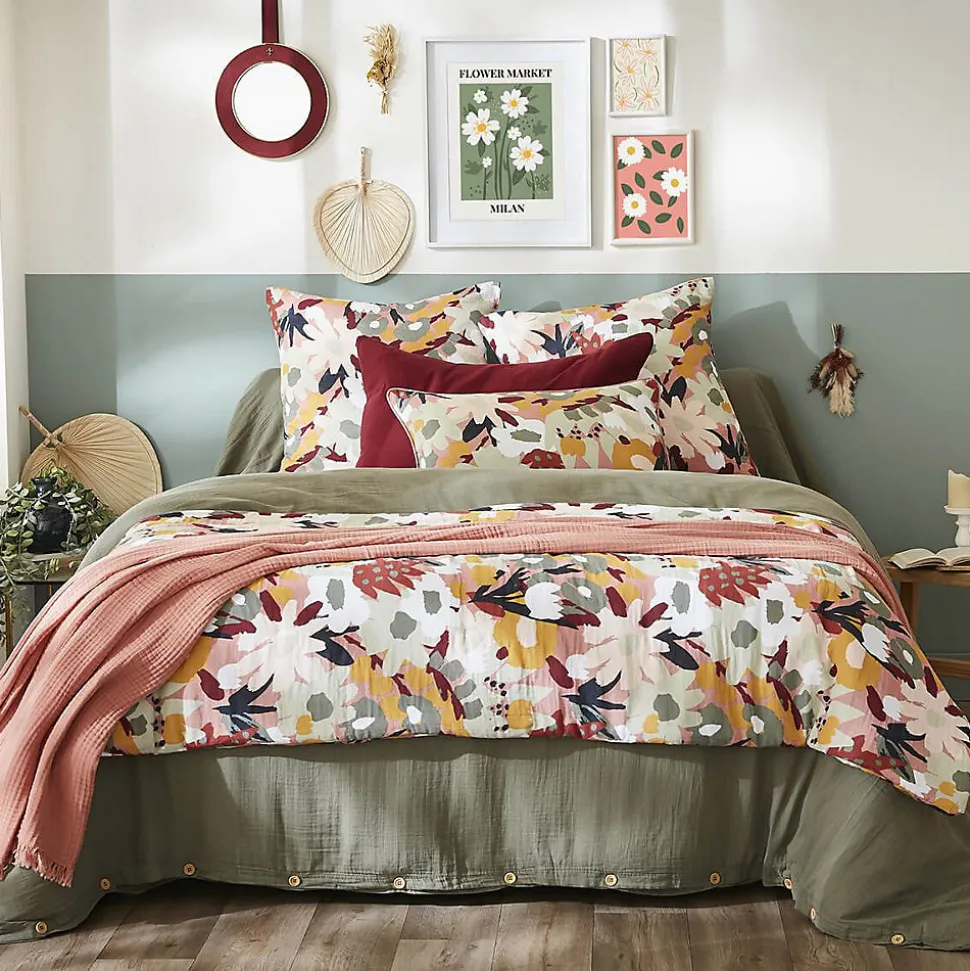- Chemin de Lit 90x200cm Gaze de Coton Imprimé Rose Imprimé Floral de la gamme Sarah. Un imprimé foral et moderne, en gaze de coton, légère, fluide et confortable.