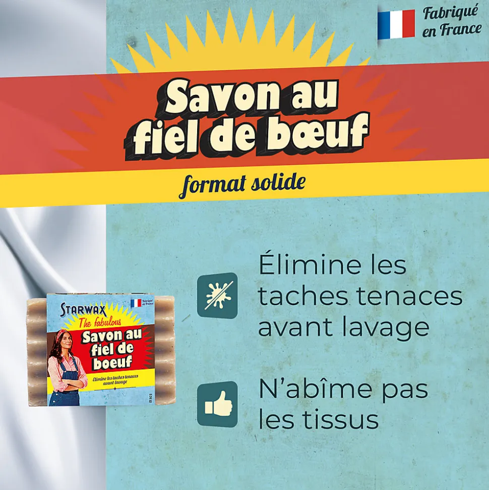 The Fabulous savon au fiel de bœuf est idéal pour tous types de textiles mais également pour le linge délicat comme la soie. Plus du produit : Idéal pour les textiles délicats. Elimine les tâches tenaces avant lavage. S’utilise sur les tâches fraiches et avant le passage en machine. Il suffit d’humidifier le textile, de frotter directement sur la tâche et de mettre le linge immédiatement en machine.
