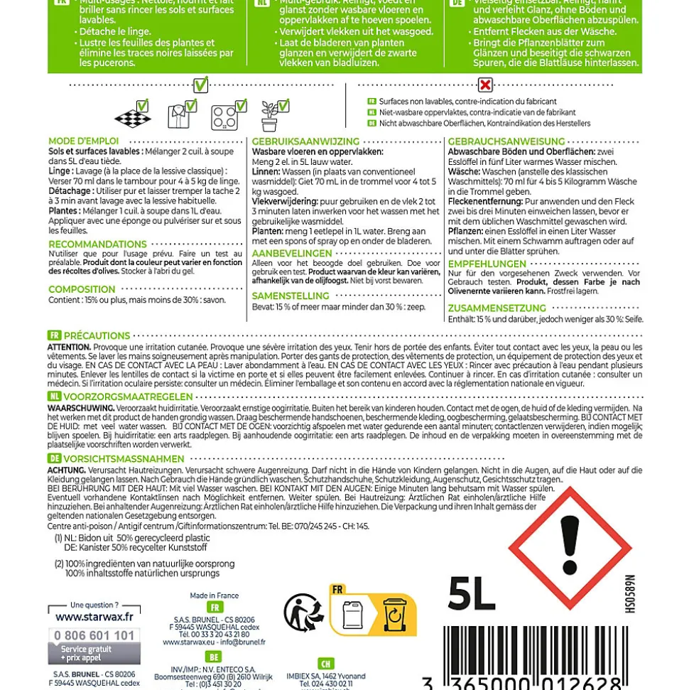 Le Savon noir à l’huile l’olive en bouteille 5 L est cuit au chaudron selon la méthode de Marseille, à l’ancienne et sous la responsabilité d’un maître savonnier.Ce pur savon végétal à base d’huile d’Olive est fabriqué à l’aide d’ingrédients actifs. Sa Formule concentrée (sans solvant, sans colorant, sans parfum ni graisse animale et non testé sur les animaux) est idéale pour la maison, le textile et le jardin.Pour la maison : nettoie, nourrit, dégraisse et fait briller toutes les surfaces (sols carrelés, plastifiés, terre cuite, vitres, cuisinières, plaques de cuisson, fours,…).Pour le textile : enlève les taches de graisse et remplace la lessive classique.Pour le jardin : lustre les feuilles et élimine les traces noires (fumagine) laissées par les pucerons.. Très utile pour le ménage, le linge et le jardin.