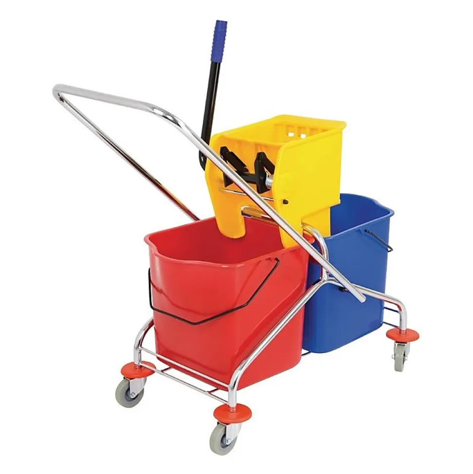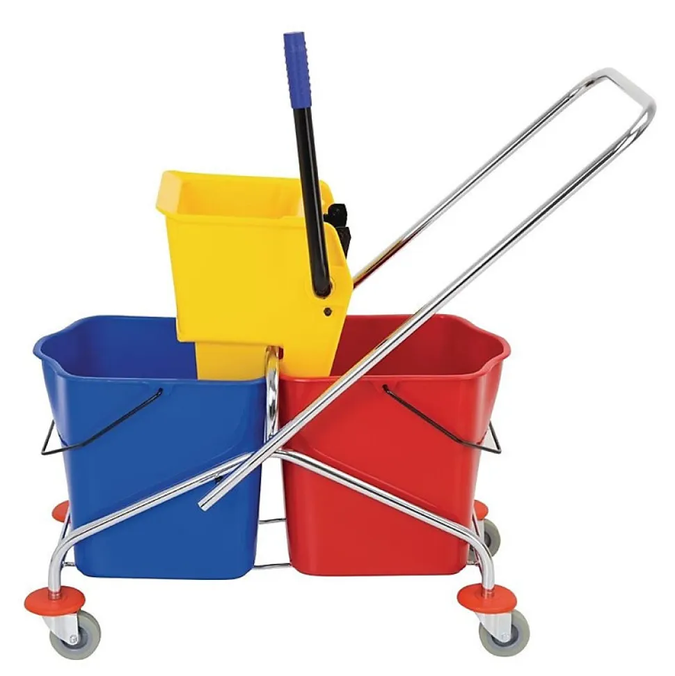 Seau avec un double mop incluant un presse d’essorage de la marque Jantex Système à Mop résistant en polypropylène. Utilisez un seau pour l’eau propre et l’autre pour l’eau sale.Caractéristiques:Marque: JantexCapacité: 23LDimensions: 860(H) x 410(l) x 995(L)mmPoids: 9,4 kgCapacité : 2 x 23L4 roulettes anti-tracesChariot Inox