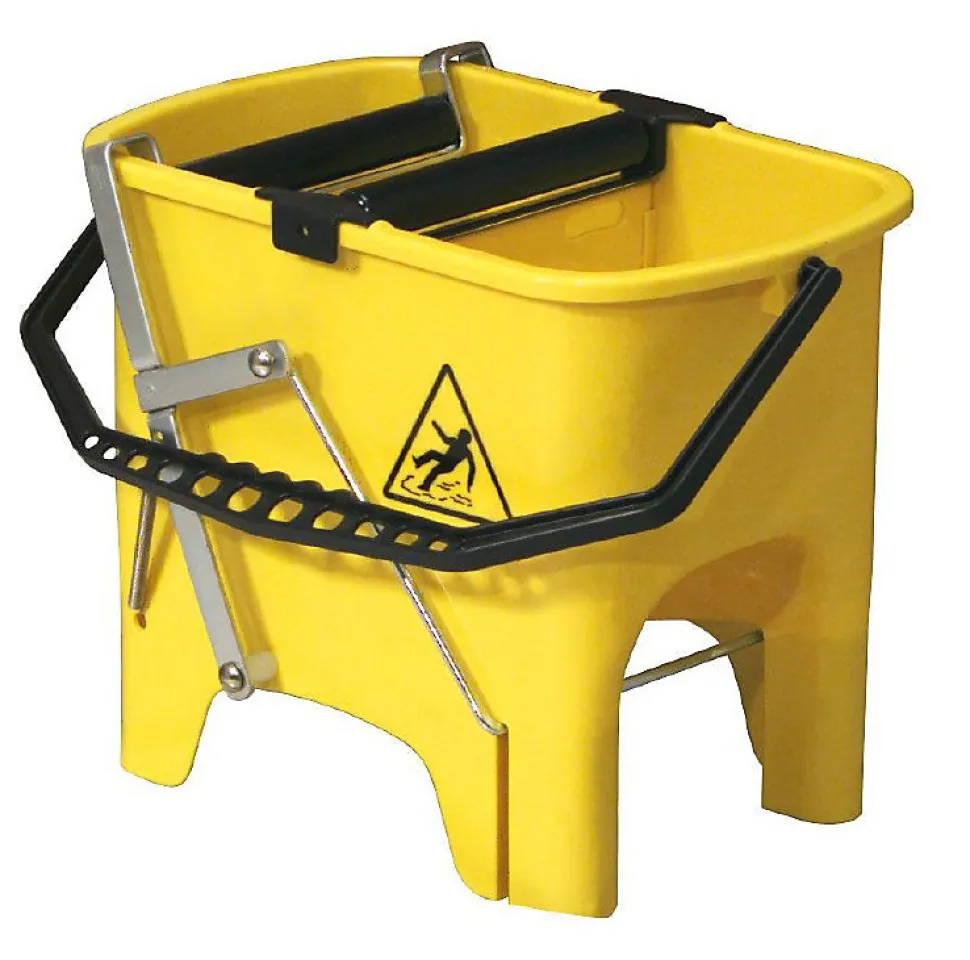 Seau lavage avec presse rouleau integree – Lot de 2 Composé d’un seau en matière plastique avec une cloison de séparation des eaux et deux rouleaux d’essorage. Un rouleau est ancré au seau. alors que l’autre travaille grâce à des leviers en acier galvanisé. que l’opérateur actionne avec son pied. en évitant ainsi de devoir se baisser et de se fatiguer le dos. Le double rouleau assure un essorage excellent quel que soit le système de lavage.La poignée. située dans la partie allongée permet de soulever le SQUIZZY en toute sécurité même lorsque le niveau des solutions est différent. Le professionnalisme du lavage est assuré par la possibilité de rincer l’ustensile avant de le tremper dans la solution chimique