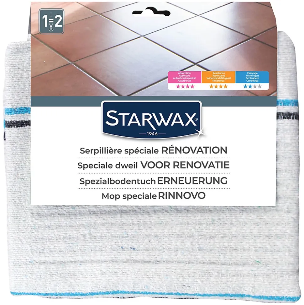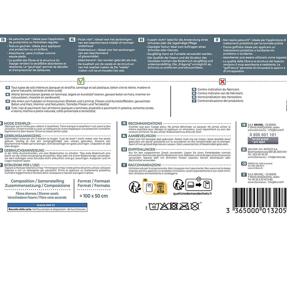 - Conseil d’utilisation : Découper par le milieu pour obtenir 2 serpillières / Rincer abondamment avant la 1ère utilisation / Utiliser humide ou avec un nettoyant pour sols pour une efficacité renforcée / Pour appliquer une protection, humidifier légèrement à l’eau et bien essorer avant d’étaler le produit / Bien rincer à l’eau claire après usage et faire sécher à plat