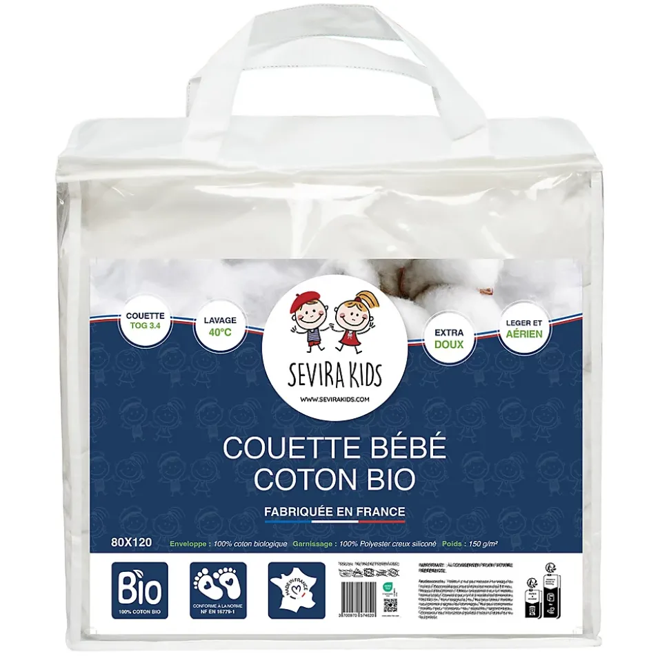 Une couette bébé en coton biologique pour un sommeil plein de douceurOffrez à votre bébé des nuits paisibles et réconfortantes avec la couette tempérée en coton biologique signée Sevira Kids, un indispensable du linge de lit pour enfant fabriqué en France avec passion. Grâce à son indice TOG 3.4, elle est parfaitement adaptée aux chambres dont la température se situe entre 15 et 20°C, assurant un confort thermique idéal tout au long de la nuit.Cette couette bébé en coton bio, confectionnée à partir de matières certifiées, crée un sain et bienveillant pour la peau délicate des tout-petits. Son enveloppe 100% coton biologique et son garnissage moelleux offrent un toucher doux, respirant et léger, favorisant un sommeil naturel et réparateur dès le plus jeune âge.Fabriquée en France, cette couette s’intègre harmonieusement à toutes les parures de lit bébé et complète avec élégance la large gamme de linge de lit Sevira Kids, pensée pour envelopper bébé dans un cocon de tendresse et de sécurité.Caractéristiques techniques de la couette bébé Sevira KidsEnveloppe 100% coton biologique – douce, naturelle et composée de matières certifiées. – respectueuse de la peau sensible des bébés.Indice TOG 3.4 – idéal pour les chambres tempérées entre 15 et 20°C.Fabrication française – savoir-faire artisanal et qualité durable.Disponible en deux tailles : 80×120 cm et 100×140 cm