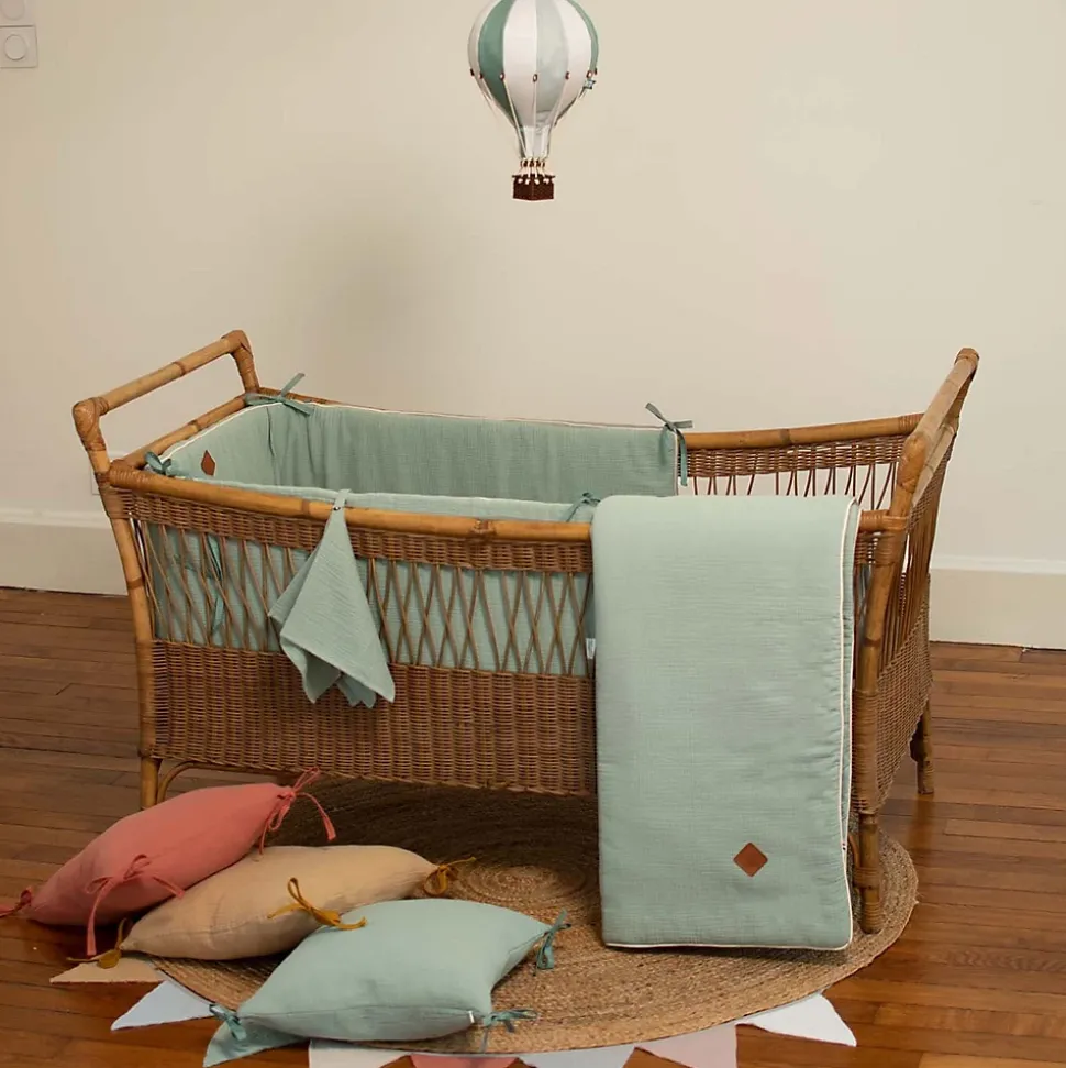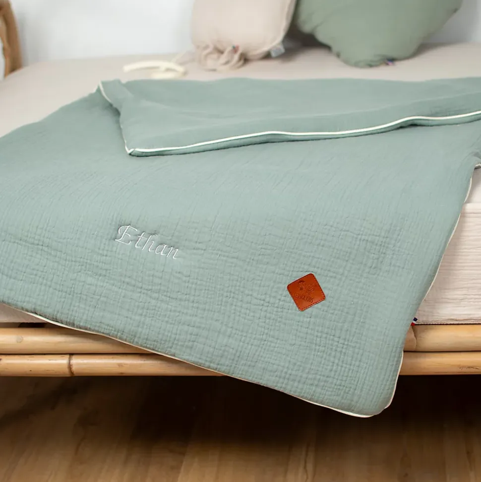 La première couverture bébé en gaze de coton – douceur et multi-usages !Offrez à votre bébé le confort d’une couverture légère et douce pour ses premiers moments sous une couette. Idéale pour le transitionner après la gigoteuse, cette couverture en gaze de coton assure à bébé un nid de tendresse. Nomade et pratique, elle peut être facilement transportée partout, accompagnant votre enfant lors de ses siestes ou moments de détente.Polyvalente, cette couverture multi-usage peut servir dans diverses situations :Plaid pour les sorties, légère et aéréeLinge de lit couffin, berceau on la utilise souvent comme la première couetteTapis d’éveil d’appoint pour offrir un douillet pendant les moments de jeu.Couvre-lit pour apporter une ambiance cocooning à la chambre de bébé.Caractéristiques de la première couverture bébé en coton – Made in FranceTaille : 70 x 100 cm, idéale pour envelopper bébé.Double face en 100% gaze de coton, offrant douceur et respirabilité.Doublé et ouatiné avec un garnissage en fibres creuses siliconées, également fabriqué en France.Personnalisable : Rendez cette couverture unique en la personnalisant avec le de votre enfant ou un motif spécial. Une soignée en fait un cadeau mémorable, idéal pour une naissance ou toute autre occasion spéciale.Fabrication locale : Conçue et produite dans nos ateliers en France pour une qualité de fabrication irréprochable.Coton et garnissage issus de matériaux certifiés REACH, garantissant des matières pour la santé et