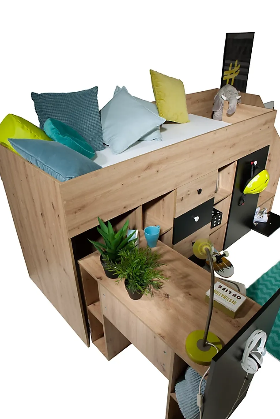 Meuble Multifonctionnel:Nous vous proposons une solution révolutionnaire – le lit superposé avec bureau, armoire, étagères ouvertes, 3 tiroirs et des marchepieds avec battants orientés vers le bas et espace de rangement. Vous pouvez choisir le côté pendant le montage. Ce meuble moderne vous permettez d’avoir tous les objets nécessaires à portée de la main. Vous pouvez choisir la côté de lit pendant le montage. Lit Superposé pour Chambre Ado:Le lit superposé est un meuble nécessaire dans une chambre d’enfant ou d’adolescent. Cette option est très confortable, parce que vous pouvez optimiser l’espace de la chambre et gagner de la place, ce qui est excellent pour les petits espaces. Spécifications Techniques:largeur : 248,5 cm,hauteur : 123 cm,profondeur : 93 cm.Espace de couchage : 90 x 200 cm.Dimensions supplémentaires : bureau (L 88 / H 76 / P 45,5 cm / espace pour les jambes 50 cm), armoire : largeur – 46.4 / hauteur – 88.9 / profondeur – 93 cm, hauteur du rail supérieur – 30 cm. Construction Solide:Le lit superposé est fabriqué en plateau stratifiée d’épaisseur 16 mm, chants finis avec un placage en PVC durable et résistant à l’usage quotidien, dos du meuble en panneau HDF, les tiroirs se déplacent sur des glissières à rouleaux, poignées en MDF. Livraison et Montage:Attention ! Notre entreprise de transport n’offert pas la possibilité de monter par l’escalier sur l’appartement et n’offert pas le service de montage. Les meubles sont livrés dans les paquets avec l’instruction de montage soi-même. La livraison est sur la palette. Information téléphonique sur la date de livraison. Veuillez demander un numéro de contact actualisé.
