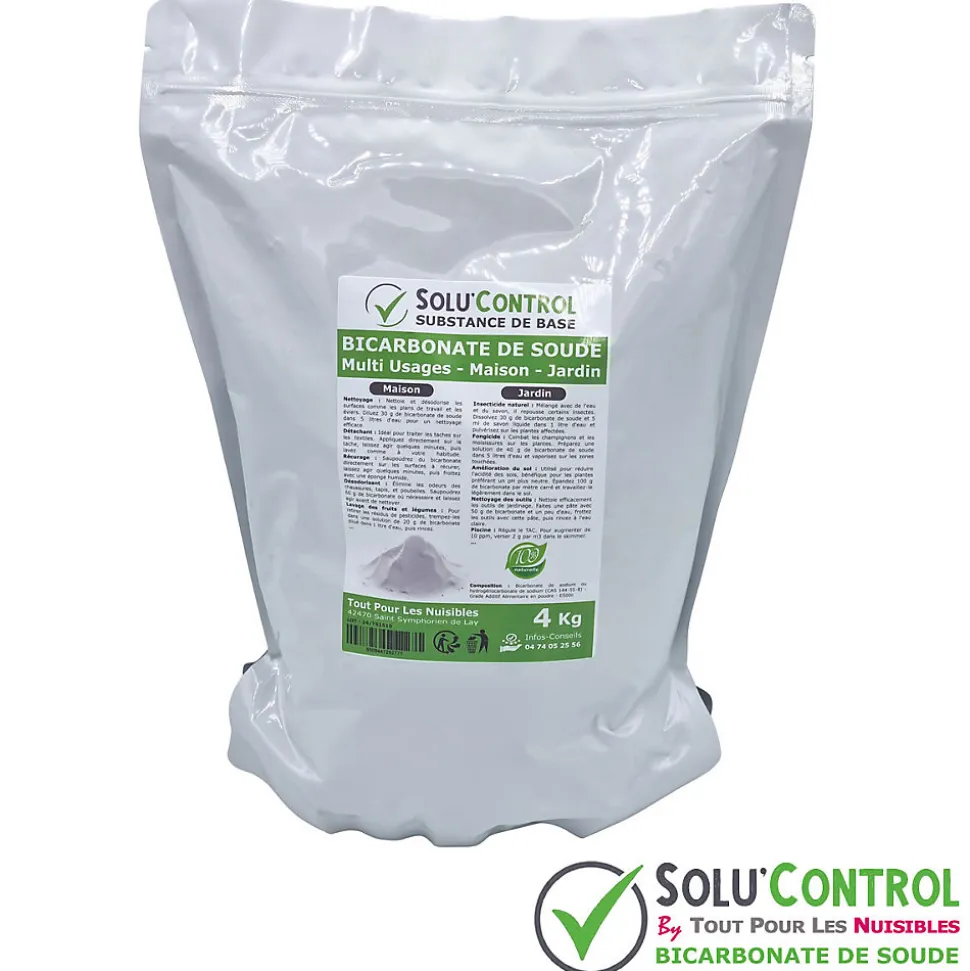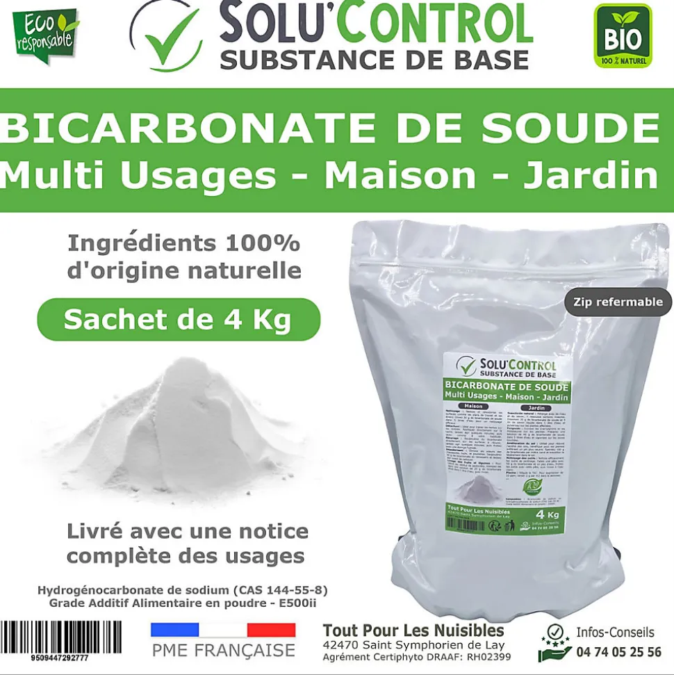 Le bicarbonate de soude Solu’Control est un produit polyvalent qui vous accompagnera dans toutes vos tâches ménagères et de jardinage. En tant que substance 100 % naturelle, il représente une alternative saine et durable aux produits chimiques traditionnels, aussi bien pour l’entretien de votre maison que pour celui de votre jardin.Le bicarbonate de soude Solu’Control est un produit bio, conçu pour répondre aux attentes de ceux qui souhaitent prendre soin de l’environnement tout en profitant de l’efficacité d’une solution naturelle. Sa composition 100 % d’origine naturelle le rend non dangereux pour l’homme et pour l’environnement. De plus, il est fabriqué en France, garantissant une qualité supérieure et une empreinte carbone réduite.L’hydrogénocarbonate de sodium est considéré comme une substance de base et est donc autorisé en Agriculture Biologique.Composition : Bicarbonate de sodium ou hydrogénocarbonate de sodium (CAS 144-55-8) – Grade Additif Alimentaire en poudre – E500iiBICARBONATE DE SOUDE NATUREL À 100 % : Ce produit contient des ingrédients 100 % d’origine naturelle pour un usage sûr.MULTI-USAGES : Polyvalent, ce bicarbonate peut être utilisé dans la maison comme au jardin pour diverses tâches de nettoyage et d’entretien.SACHET PRATIQUE DE 4 KG : Conditionnement pratique et refermable pour conserver la fraîcheur du produit.NOTICE COMPLÈTE : Livré avec une notice détaillée expliquant les différentes utilisations possibles du bicarbonate de soude.PRODUIT FRANÇAIS : Fabriqué en France par une entreprise certifiée, pour une qualité et une traçabilité garanties.