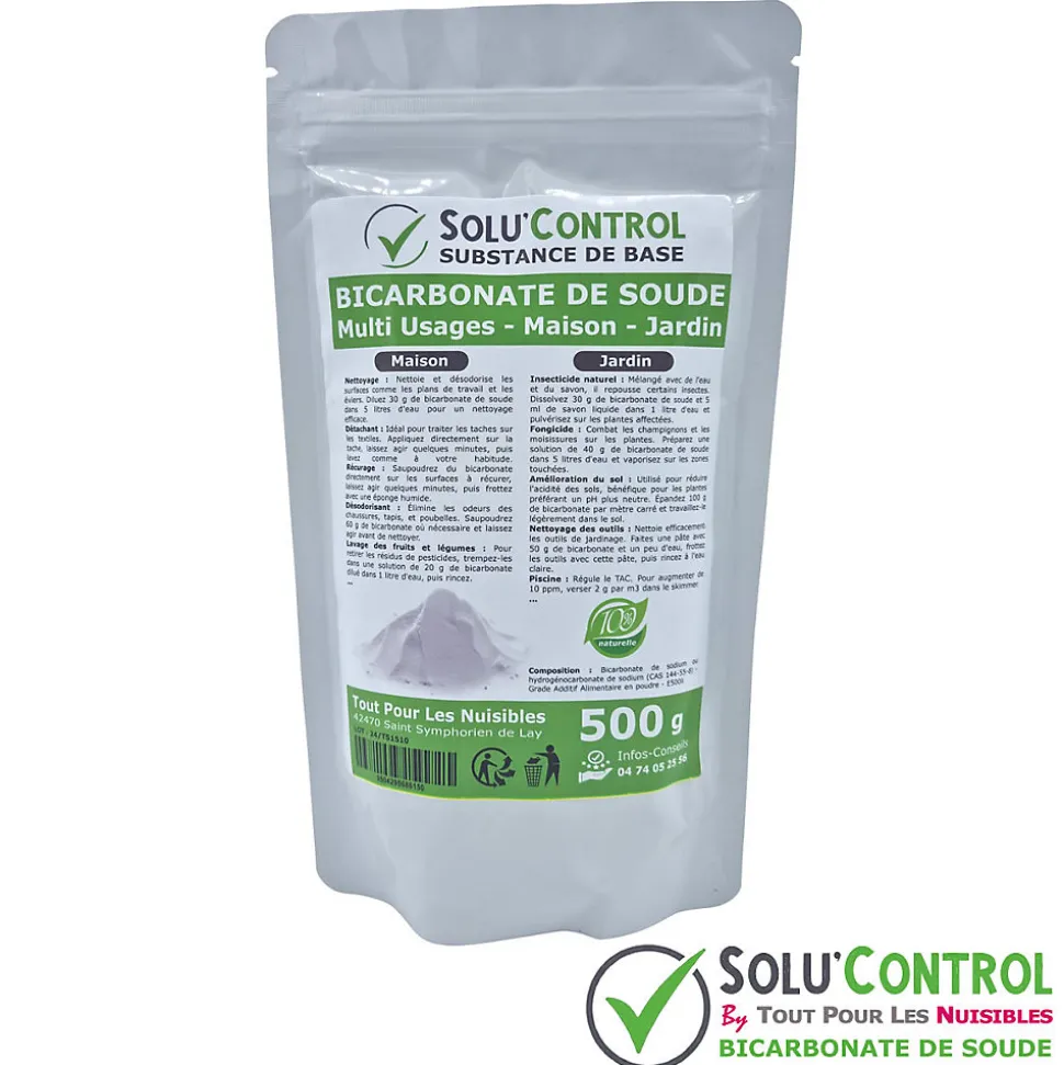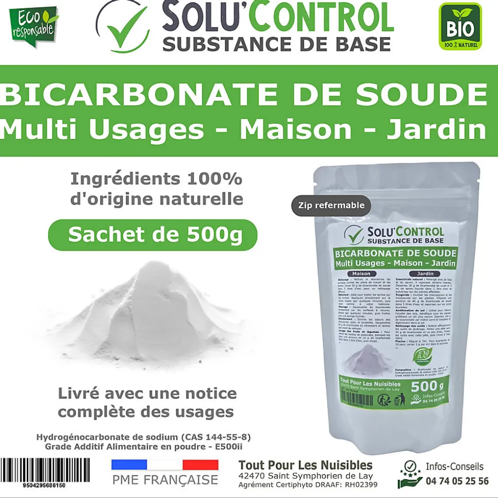 Le bicarbonate de soude Solu’Control est un produit polyvalent qui vous accompagnera dans toutes vos tâches ménagères et de jardinage. En tant que substance 100 % naturelle, il représente une alternative saine et durable aux produits chimiques traditionnels, aussi bien pour l’entretien de votre maison que pour celui de votre jardin.Le bicarbonate de soude Solu’Control est un produit bio, conçu pour répondre aux attentes de ceux qui souhaitent prendre soin de l’environnement tout en profitant de l’efficacité d’une solution naturelle. Sa composition 100 % d’origine naturelle le rend non dangereux pour l’homme et pour l’environnement. De plus, il est fabriqué en France, garantissant une qualité supérieure et une empreinte carbone réduite.L’hydrogénocarbonate de sodium est considéré comme une substance de base et est donc autorisé en Agriculture Biologique.Composition : Bicarbonate de sodium ou hydrogénocarbonate de sodium (CAS 144-55-8) – Grade Additif Alimentaire en poudre – E500iiBICARBONATE DE SOUDE NATUREL À 100 % : Ce produit contient des ingrédients 100 % d’origine naturelle pour un usage sûr.MULTI-USAGES : Polyvalent, ce bicarbonate peut être utilisé dans la maison comme au jardin pour diverses tâches de nettoyage et d’entretien.SACHET PRATIQUE DE 500 G : Conditionnement pratique et refermable pour conserver la fraîcheur du produit.NOTICE COMPLÈTE : Livré avec une notice détaillée expliquant les différentes utilisations possibles du bicarbonate de soude.PRODUIT FRANÇAIS : Fabriqué en France par une entreprise certifiée, pour une qualité et une traçabilité garanties.COMPOSITION : Bicarbonate de sodium ou hydrogénocarbonate de sodium (CAS 144-55-8) – Grade Additif Alimentaire en poudre – E500ii
