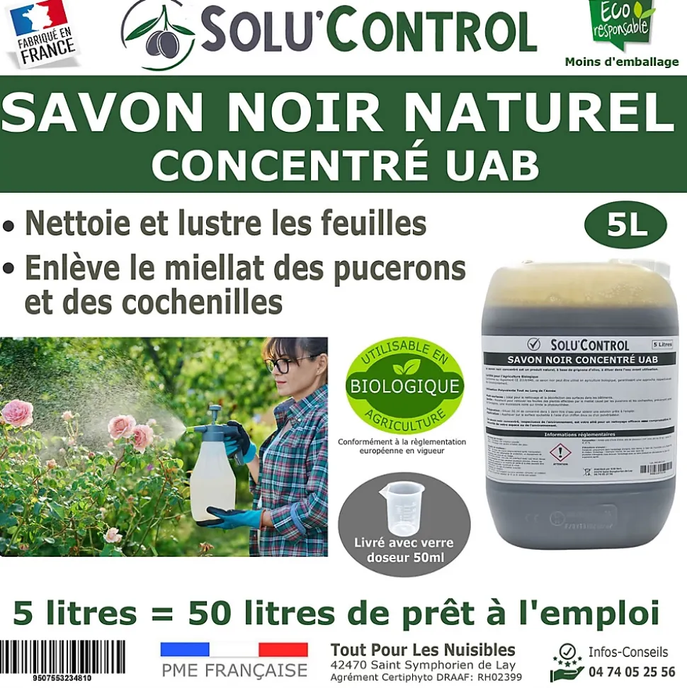 Le savon noir concentré est un produit naturel, à base de grignons d’olive, à diluer dans l’eau avant utilisation.Certifié pour l’Agriculture BiologiqueConforme au règlement CE 2018/848, ce savon noir peut être utilisé en agriculture biologique, garantissant une approche durable et saine.Utilisation Polyvalente Tout au Long de l’AnnéeCe savon noir concentré, naturel, est votre allié pour un nettoyage efficace sans compromettre la sécurité de votre espace ou de la nature.Usages à la MaisonSurfaces : Diluez le savon pour nettoyer plans de travail, carrelages et autres surfaces lavables. Il dégraisse et fait briller sans traces.Sols : Quelques cuillères à soupe dans un seau d’eau suffisent pour laver parquet, carrelage ou linoléum.Linge : Ajoutez-le à votre lessive pour un linge propre et frais, efficace contre les taches.Vaisselle : Une petite dose dans l’eau chaude dégraisse et nettoie sans effort.Usages au JardinOutils et mobilier : Solution diluée pour nettoyer pots, outils et mobilier, protège aussi contre la rouille.Animaux : Nettoie et fait briller le pelage.Feuilles : Pulvérisez une solution diluée pour éliminer le miellat et prévenir la fumagine.Atouts pratiquesConcentré permettant de limiter les emballages. Utilisez votre propre pulvérisateur.Fabriqué en France à partir de grignons d’olives d’origine française, favorisant le circuit court et l’économie locale.Préparation : Diluer 50 ml de concentré dans ½ litre d’eau pour une solution prête à l’emploi.Précautions :Tester sur une petite surface avant usage.Ne pas ingérer. En cas de contact avec les yeux, rincer abondamment.Notre savon noir concentré est la solution idéale pour entretenir efficacement maison et jardin.