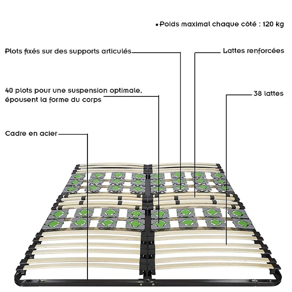 - Sommier à lattes ergonomique équipé de plots de soutien lombaire et au niveau des épaules.