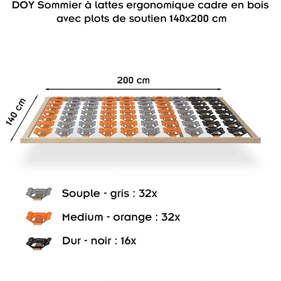 DOY Sommier à lattes ergonomique cadre en bois avec plots de soutien. CARACTÉRISTIQUES : Ce sommier à lattes ergonomique en bois avec plots de soutien est de haute qualité, conçu pour offrir un confort optimal pendant votre sommeil. Avec ses 7 zones de confort, il assure un soutien précis pour chaque partie de votre corps, en réduisant la pression exercée sur les zones les plus sensibles telles que les épaules et les hanches. Libre à vous d’organiser les plots comme vous le souhaitez afin de maîtriser la dureté de chaque zone du sommier. Les lattes sont fabriquées en bois de qualité et disposées de manière à optimiser la ventilation de votre matelas. L’humidité ne s’accumule pas, ce qui prolonge sa durée de vie. Ce sommier est facile à installer. Structure de lit avec 6 points d’appuis au minimum recommandée. Poids maximum supporté : 140 kg. À monter soi-même. DIMENSIONS ET POIDS : Modèle 80 x 200 cm : 16 plots souples, 16 mediums et 8 durs. L 200 cm x l 80 cm x H 6 cm. Poids : 8,9 kg. Modèle 90 x 200 cm : 20 plots souples, 20 mediums et 10 durs. L 200 cm x l 90 cm x H 6 cm. Poids : 9,8 kg. Modèle 100 x 200 cm : 20 plots souples, 20 mediums et 10 durs. L 200 cm x l 100 cm x H 6 cm. Poids : 10,2 kg. Modèle 120 x 200 cm : 28 plots souples, 28 mediums et 14 durs. L 200 cm x l 120 cm x H 6 cm. Poids : 12,7 kg. Modèle 140 x 200 cm : 32 plots souples, 32 mediums et 16 durs. L 200 cm x l 140 cm x H 6 cm. Poids : 14,3 kg. À NOTER : pas de livraison en Corse ou sur les îles.