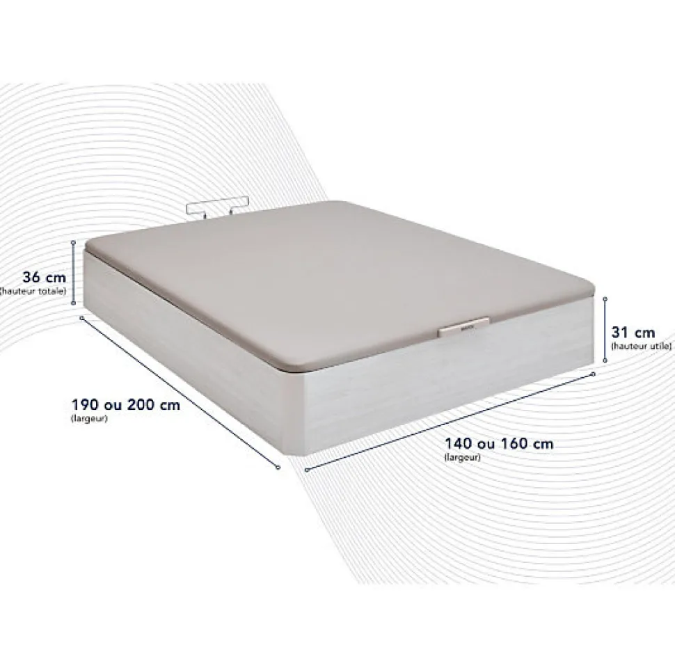 Sommier Coffre Space Up de BultexOptimisez votre espace avec le sommier coffre Space Up ! Boxspring Alliant design moderne et grande capacité de rangement de 760 litres, ce sommier au plateau tapissé en mousse vous offre un couchage confortable et un coffre discret et pratique pour désencombrer votre chambre. Son ouverture facile par vérins clipsables et sa poignée en bois finition chêne blanchi font du Space Up un meuble fonctionnel et élégant, conçu pour durer. Caractéristiques techniques :- Plateau tapissé avec garnissage mousse pour un soutien de qualité et un aspect raffiné.- Structure : Structure en acier et carton ; Face supérieure en coutil stretch ; Face inférieure intissé, 100% polypropylène- Garnissage : Garnissage en mousse blanche d’épaisseur 8mm 25kg/m³- Finitions soignées : fond rigide en MDF facile à entretenir- Hauteur totale de 36 cm intégrant un coffre de rangement spacieux de 761 litres, idéal pour stocker linge de lit, couettes, oreillers ou objets personnels.- Articulations par vérins clipsables, sans vis, permettant une ouverture et une fermeture simples et sans effort. Le montage est accessible à tous, même aux bricoleurs débutants.- Relevage du couchage à 30° offrant un accès aisé et rapide à l’espace de rangement.- Finition soignée : coffre et fond rigides garantissant robustesse et longévité. Le revêtement en mélamine résiste aux chocs et aux rayures pour une tenue impeccable dans le temps.- Poignée de relevage en bois finition chêne blanchi, à la fois design et ergonomique, apportant une touche naturelle et élégante à votre chambre. <spa