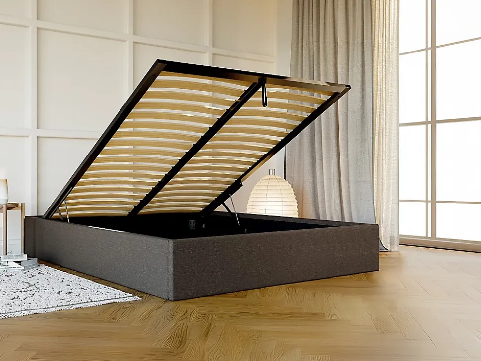 Le sommier PONTOS a tout pour vous séduire : disponible en différents coloris et matières, il apportera un côté tendance à votre chambre et son coffre vous assure un gain de place garanti !Caractéristiques Couleur (nuance) : Gris anthracite Matière (précision) : 100 % Polyester Finition : Chiné Taille (couchage) : 140 x 190 cm Nombre de places : 2 places Garnissage : Mousse polyuréthane Densité (garnissage) : 25 kg/m³ Avec pieds Technologie (sommier) : Lattes actives Nombre de lattes : 36 lattes Matière des lattes : Bois (bouleau) 1 coffre Capacité de rangement : 521 L Sens d’ouverture : Ouverture Verticale Gamme : Good for Planet, À la carte Produit : Fabriqué en Europe Charge maximale supportée : 250 kg À monter soi-mêmeDimensions Longueur : 200 cm Hauteur : 31 cm Profondeur : 150 cm Hauteur des pieds : 0.5 cm Intérieur du coffre : L.140 x l.186 x H.20 cmLivraisonLors de la livraison, il est conseillé de vérifier que le bon nombre de colis a été livré.ColisColis n°1 : Longueur 202 cm, Largeur 31 cm, Hauteur 18 cm, Poids 39 kg. Colis n°2 : Longueur 200 cm, Largeur 13 cm, Hauteur 9 cm, Poids 13 kg. Colis n°3 : Longueur 85 cm, Largeur 28 cm, Hauteur 12 cm, Poids 10 kg. Colis n°4 : Longueur 141 cm, Largeur 102 cm, Hauteur 6 cm, Poids 6 kg.