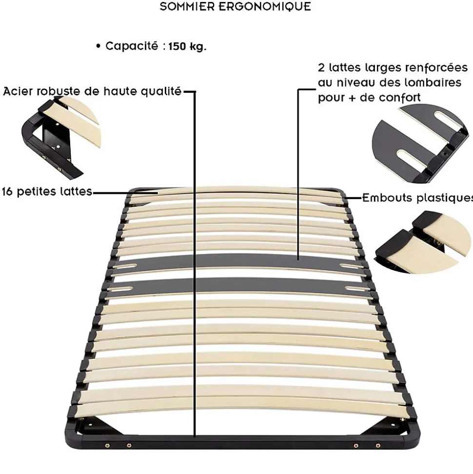 - Sommier ergonomique pour lit à lattes en bois. Renfort central avec 2 lattes assouplies au niveau du dos.