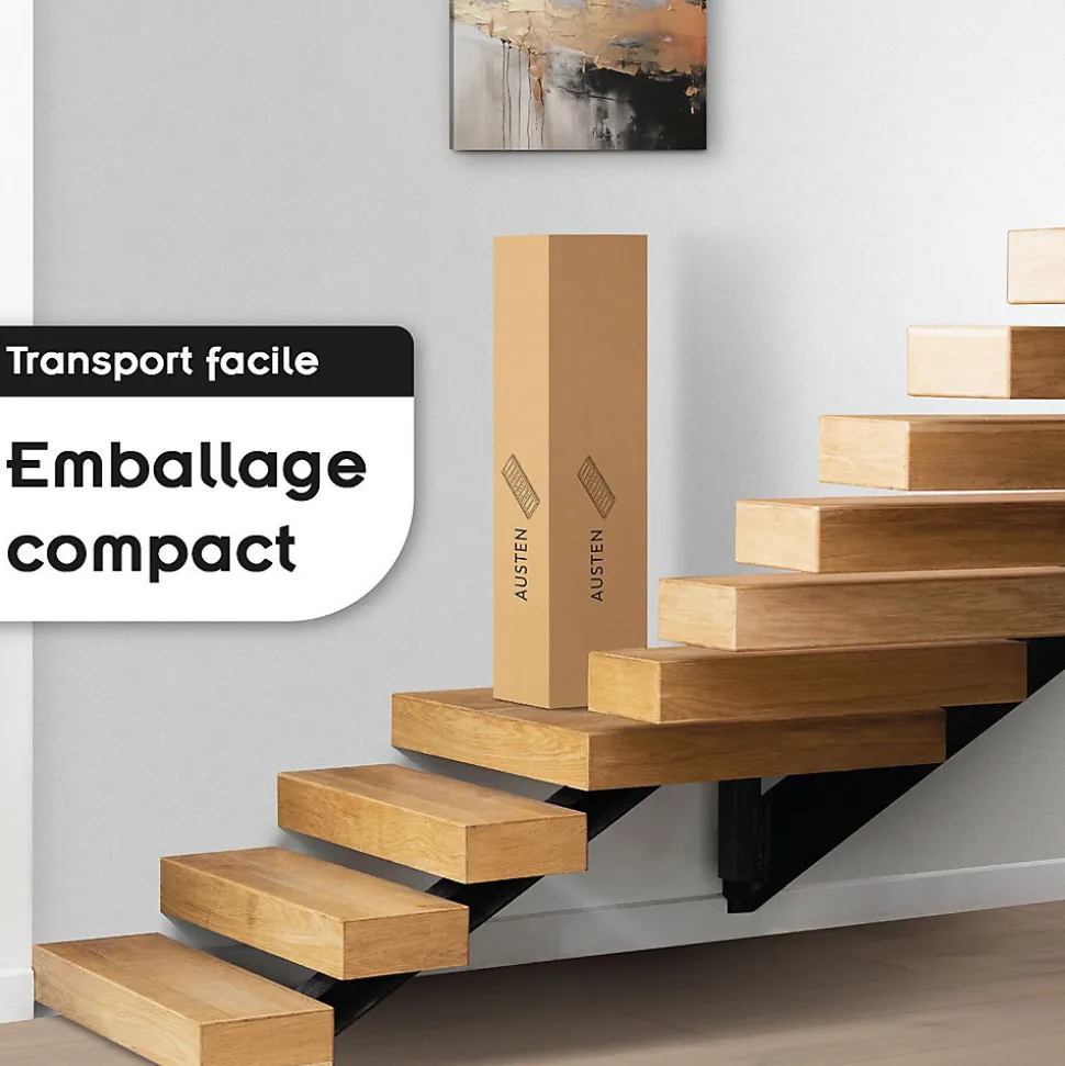 AUSTEN Sommier ergonomique à lattes larges et flexibles en bois de bouleau CARACTÉRISTIQUES : Ce sommier ergonomique est composé de lattes larges en bois de bouleau. Elles sont percées pour favoriser l’aération de votre matelas. Elles permettent un soutien adapté selon la zone et s’adaptent ainsi à la morphologie du corps, garantissant un sommeil réparateur et sans douleurs. 3 niveaux de dureté des lattes selon la zone du corps : – Dur : Tête et cou, pieds et chevilles. – Medium : Lombaires et cuisses. – Doux : Epaules et haut du dos, bassin, genoux. Le cadre de 3×3 cm est fabriqué en acier robuste de haute qualité. Ce sommier participe à la durée de vie de votre matelas et au confort de vos nuits. Les pieds en option offrent un espace de stockage sous le lit de 23 cm. 6/9 points d’appuis nécessaires pour les modèles simples/doubles. Garantie 2 ans. Convient à tous types de matelas (non inclus). À monter, montage facile. Modèles 1 place : Nombre de lattes : 10. Poids maximum : 150 kg. Modèles 2 places : Nombre de lattes : 20. Poids maximum total : 300 kg (150 kg de chaque côté). DIMENSIONS ET POIDS : Pieds en option avec hauteur réglable de 23 à 25,5 cm. Modèle 80 x 200 cm : L 198 cm x l 79 cm x H 4 cm. Modèle 90 x 200 cm : L 198 cm x l 89 cm x H 4 cm. Modèle 140 x 200 cm : L 198 cm x l 139 cm x H 4 cm. Modèle 160 x 200 cm : L 198 cm x l 159 cm x H 4 cm. Modèle 180 x 200 cm : L 198 cm x l 179 cm x H 4 cm. Modèle 200 x 200 cm : L 198 cm x l 199 cm x H 4 cm. À NOTER : pas de livraison en Corse ou sur les îles.