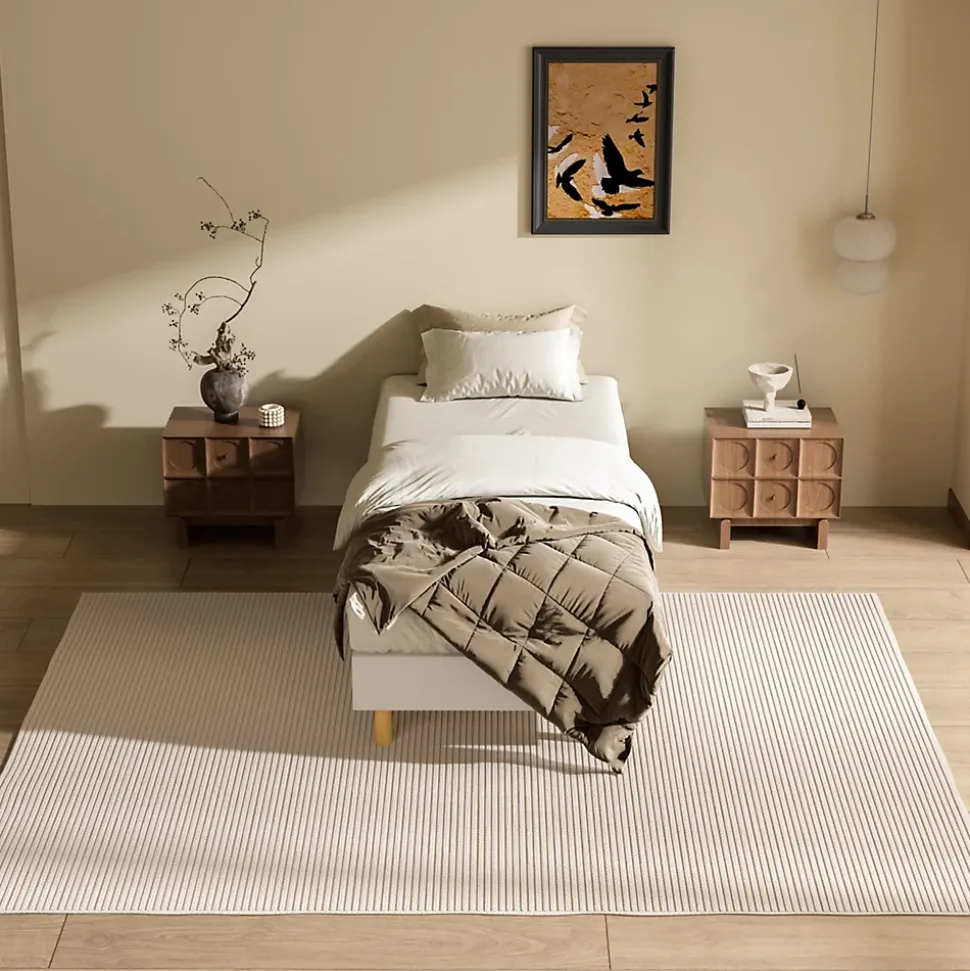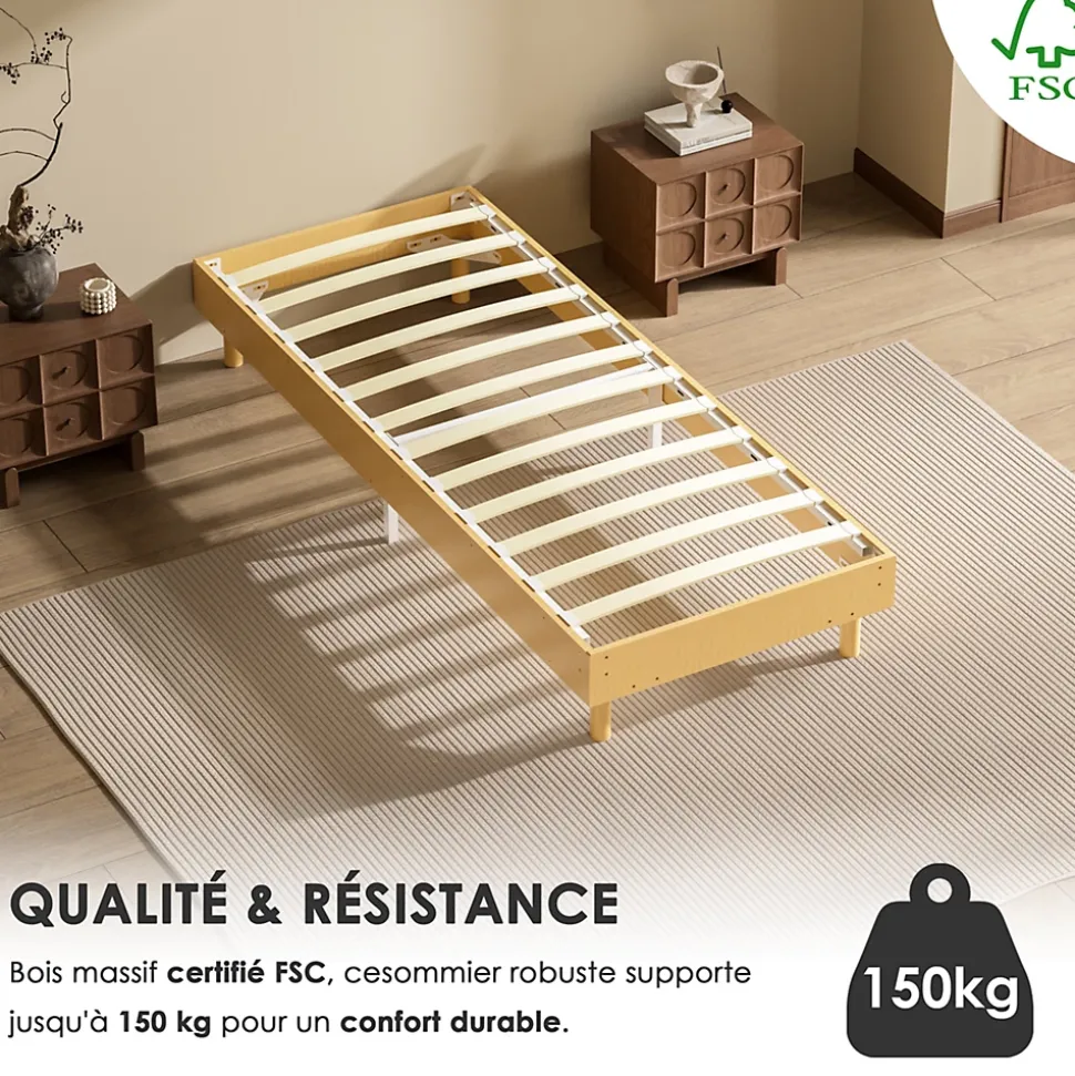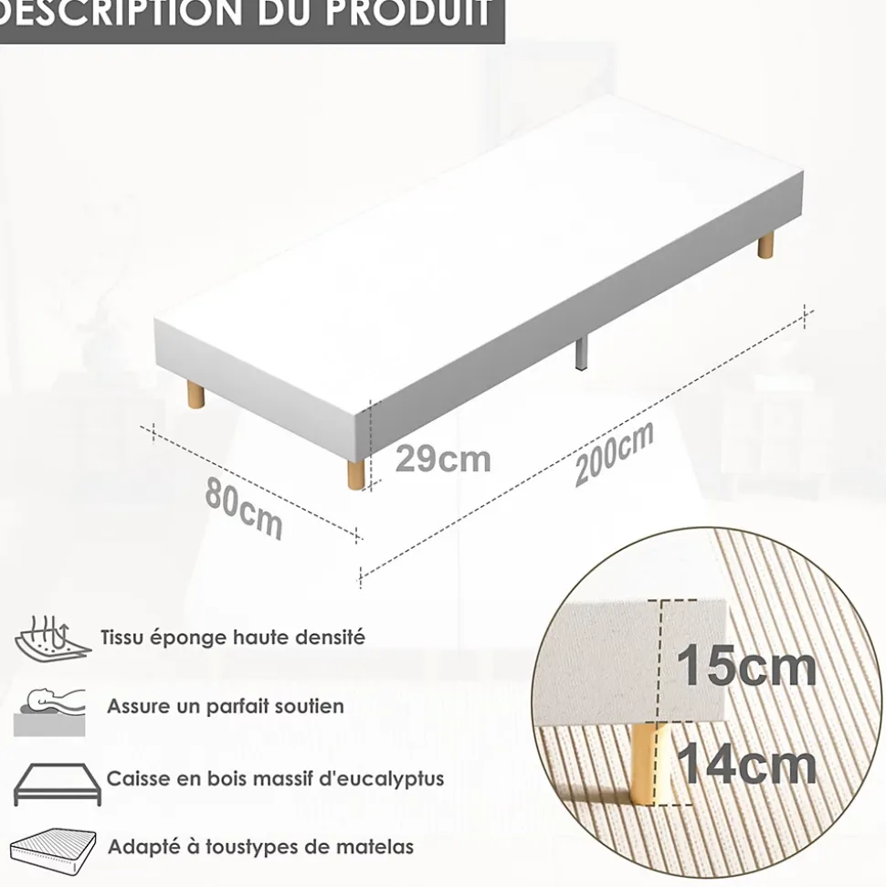 Couleur : BlancMatériau : Bois + Peuplier + MétalAssemblage requis : OuiTête de lit incluse : NonDimensions : 80 x 200 cmHauteur intérieure des pieds : 15 cmHauteur totale du lit : 29 cmHauteur entre le sol et le cadre du lit : 29 cmHauteur du rangement sous le lit : 15 cmNombre de pieds : 6Dimensions de l’emballage : 103,5 x 27 x 19 cmPoids de l’emballage : 20 kg