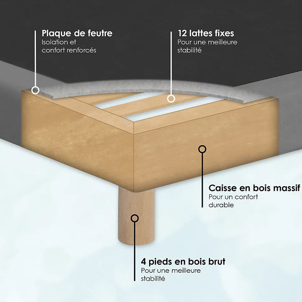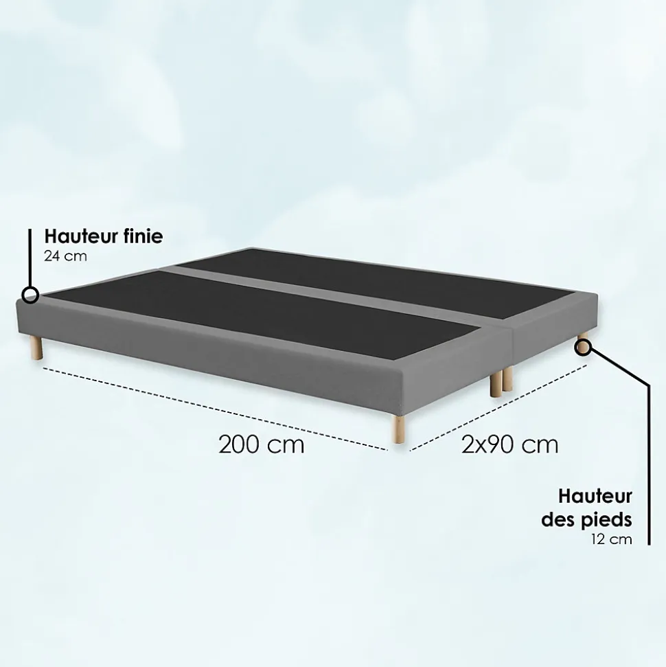 idliterie – Sommier tapissier 180×200 cmCe sommier tapissier de la marque idliterie est conçu pour un couchage de 180×200 cm, idéal pour deux personnes. Avec un soutien raffermit, ce sommier tapissier coffre à lattes offre un confort optimal. Fabriqué en bois massif, il est rembourré pour un accueil moelleux. Les lattes passives assurent une bonne ventilation du matelas. Ce sommier king size de 23 cm d’épaisseur convient à tout type de matelas. De couleur gris, il est livré avec des pieds pour une installation facile.Caractéristiques :- Type de produit : sommier tapissier- Surface du matelas : 180×200 cm- Nombre de personnes : 2- Type de soutien : raffermit- Type de sommier : sommier tapissier- Type de facette : sommier coffre tapissier à lattes- Technologie du sommier : lattes passives- Taille du lit : king- Rembourré- Matière de la structure : bois massif- Longueur du couchage : 200 cm- Largeur du couchage : 180 cm- Épaisseur du lit : 23 cm- Électrique : non électrique- Compatibilité avec tout type de matelas- Compatibilité avec sommier grand Large- Couleur : gris- Avec rangement : sans rangement- Pieds inclus : pieds fournis