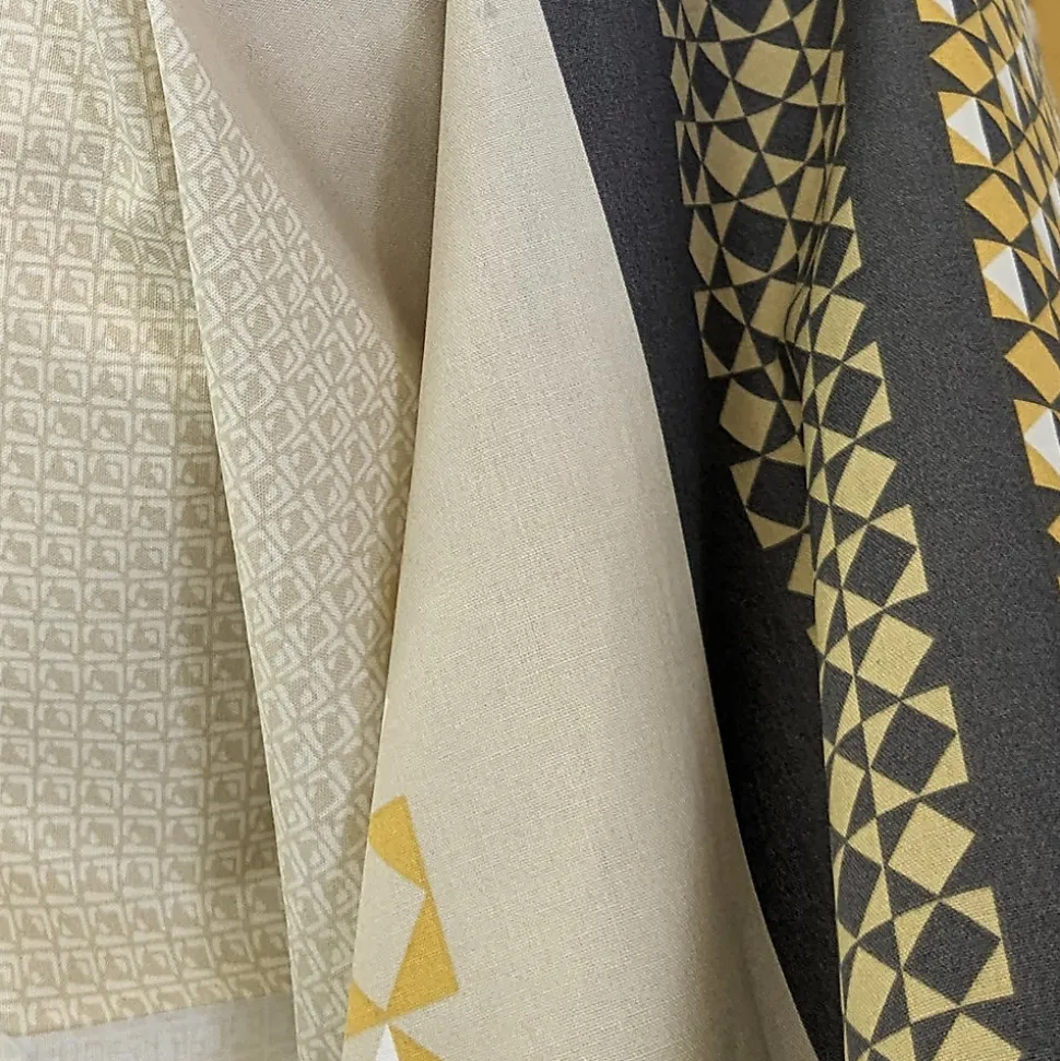 - Parure de lit 100% coton avec des motifs imprimés de jeu de rayures, associé à des micro-motifs géométriques et des effets de tissages dans des tons beige, gris et miel.