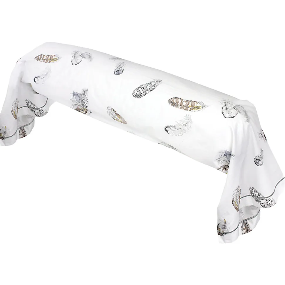 Douceur du percale pour des nuits sereines : Une taie de traversin en percale de coton au tissage serré, apportant confort et élégance. Taie de traversin 43×200 cm Percale pur coton peigné 78 fils/cm² – Ambiance pleine de douceur habillée de plumes d’oiseaux et de rubans. Coloris lin et gris sur fond blanc