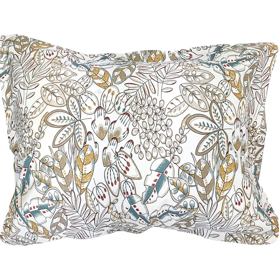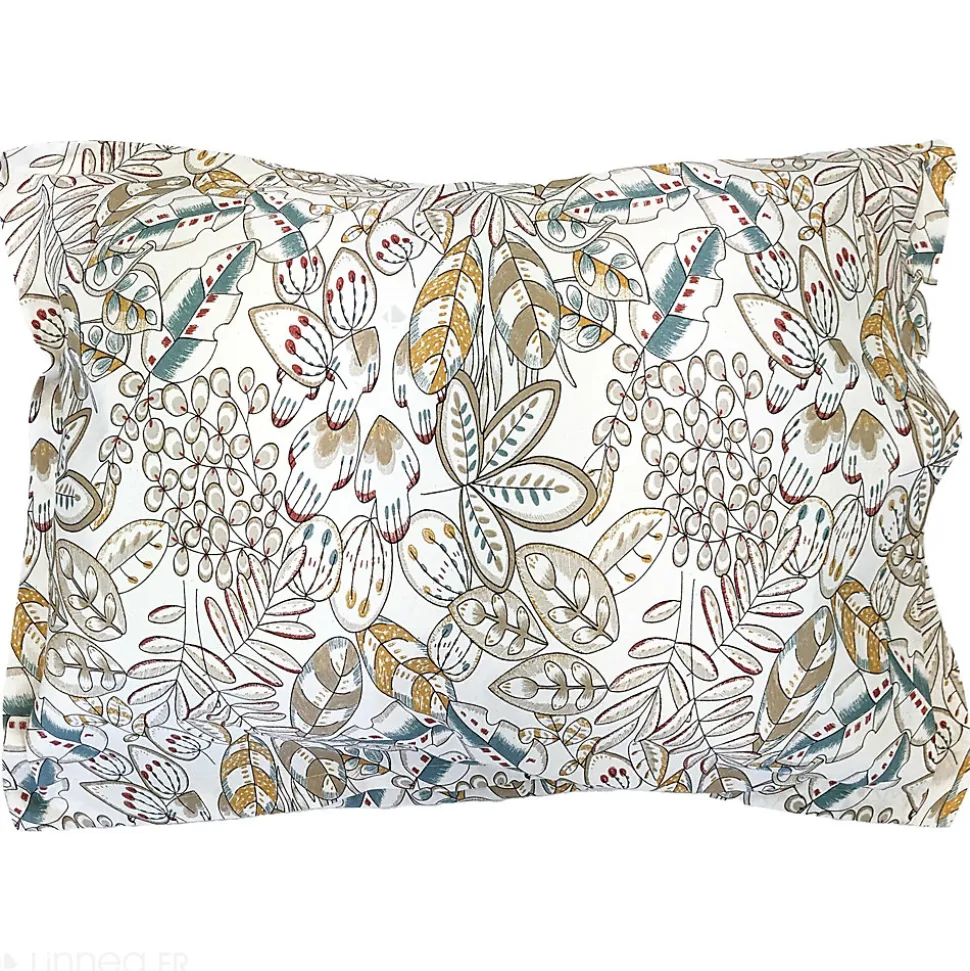 Taie d’oreiller rectangulaire 50×70 cm OKY Naturel Parure de lit 100% coton avec motifs imprimés de feuillage avec des subtiles touches de couleur jaune, bleu et rouge sur fond écru.