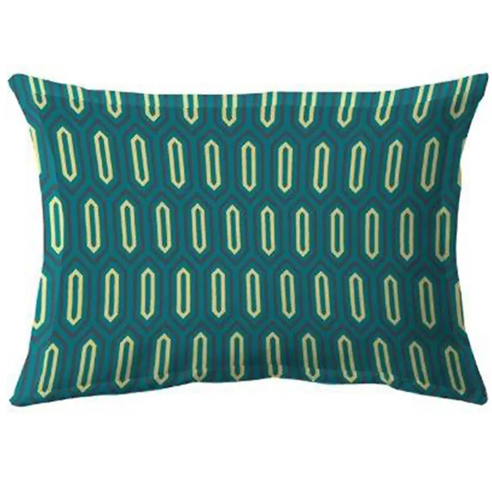 - Taie d’oreiller rectangulaire 50×70 cm Percale PAST Parure de lit en percale de coton avec un motif de losanges imbriqués formant un effet géométrique moderne dans des tons de jaune et bleu sur fond bleu canard.