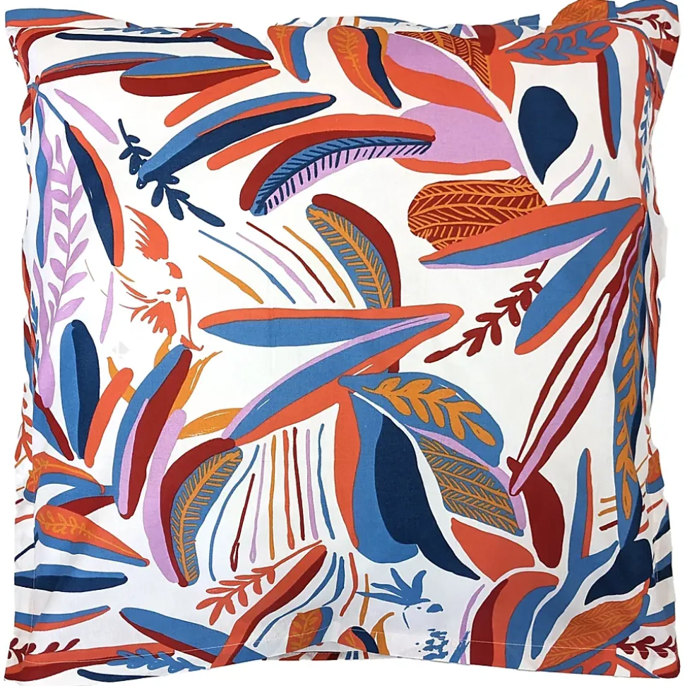 Taie d’oreiller carrée 65×65 cm PERROQUET Salsa Parure de lit 100% coton avec motifs imprimés d’un feuillage coloré dans lequel se cachent perruches et cacatoès dans des tons de rose, rouge, orange et bleu sur fond blanc.