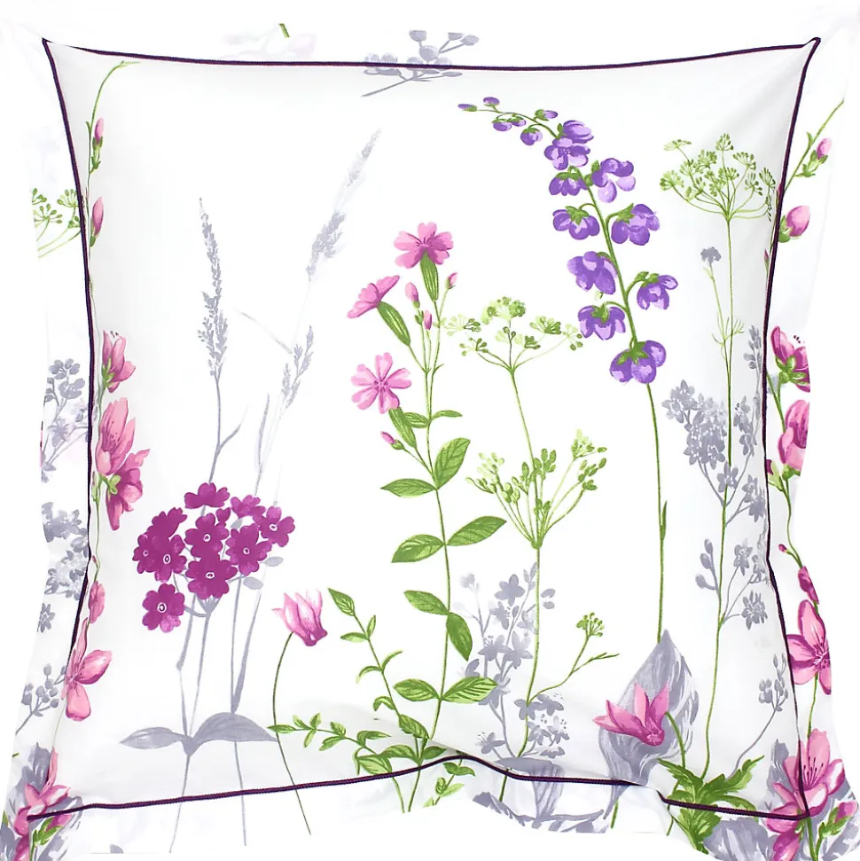 - Taie d’oreiller carrée 65×65 cm 100% coton 57 fils/cm² – PRETTY Parure de lit 100% coton avec des motifs de grandes fleurs dans des nuances de rose, violet et vert sur fond blanc.