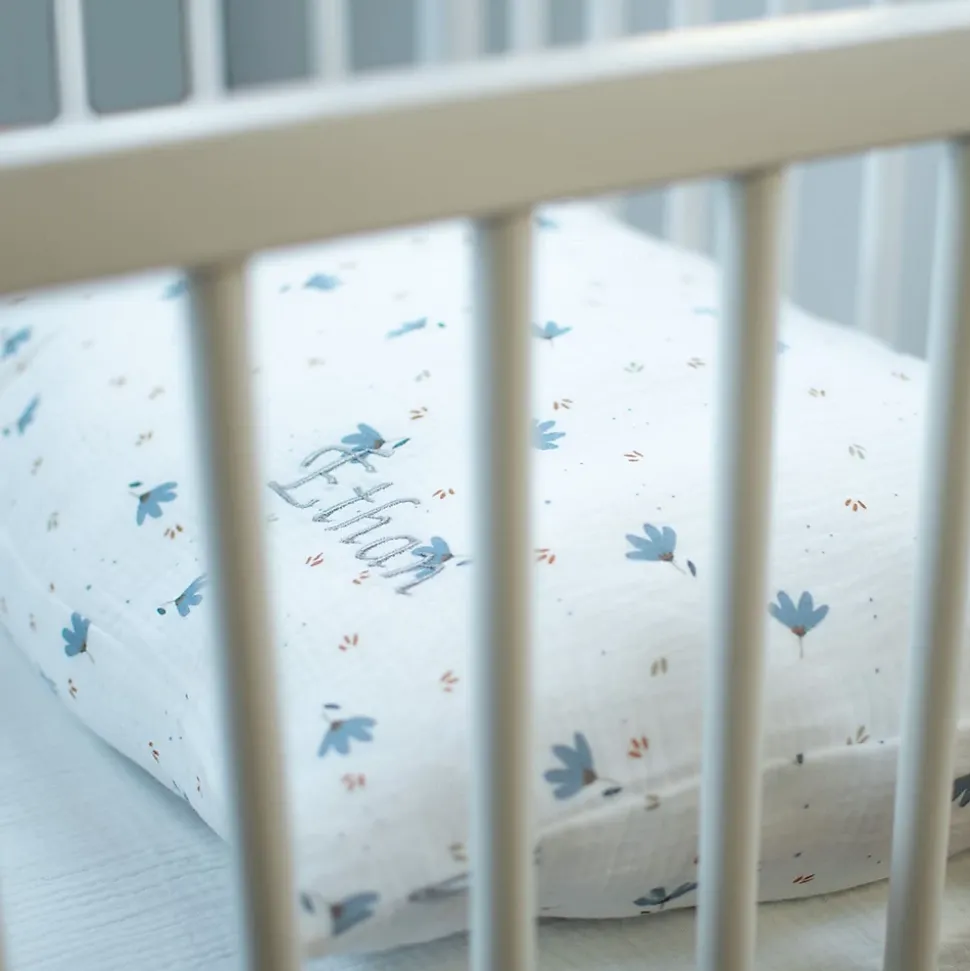 Une magnifique taie d’oreiller enfant en gaze de coton aux charmants motifs de fleurs Bleuet pour envelopper de douceur votre bébé. 100% Made in France
