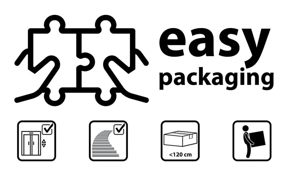 - Système Easy Packaging, vous pourrez le transporter facilement. Emballage adapté pour un transport facile, tous nos colis pèsent moins de 30 kgs et mesurent moins de 120cm.