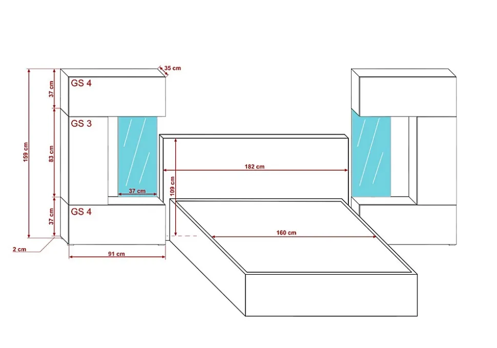 L’ensemble comprend : 2 armoires de rangement design attenants au lit Dimensions : – Largeur : 345-385 cm – Hauteur : 159 cm – Profondeur : 35 cm Toutes les dimensions détaillées dans les images du produit Matériaux: – Structure en panneau de particules – Façades en MDF, feuille de finition brillant NON LAQUÉE Coloris : noir mat et noir brillant * Ensemble vendu sans lit * Les lumières LED ne sont pas incluses