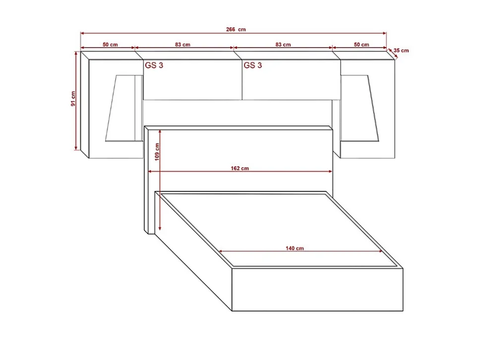 L’ensemble comprend : structure murale composée de 4 armoires de rangement Dimensions : – Largeur : 266 cm – Hauteur : 91 cm – Profondeur : 35 cm Toutes les dimensions détaillées dans les images du produit Matériaux: – Structure en panneau de particules – Façades en MDF, feuille de finition brillant NON LAQUÉE Couleur : blanc et blanc brillant * Ensemble vendu sans lit * Les lumières LED ne sont pas incluses