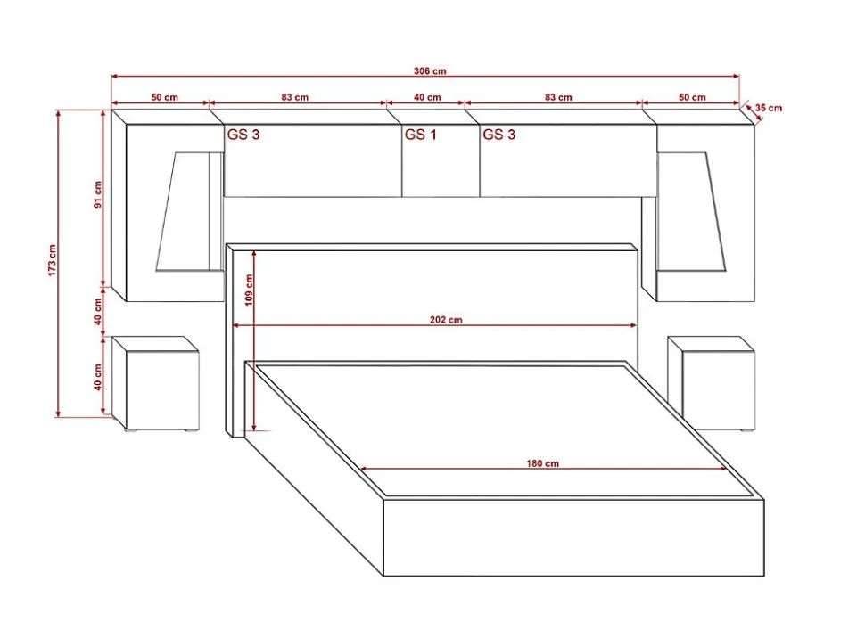 L’ensemble comprend : structure murale composée de 4 armoires de rangement. Comprend 2 tables de chevet Dimensions : – Largeur : 306 cm – Hauteur : 173 cm – Profondeur : 35 cm Toutes les dimensions détaillées dans les images du produit Matériaux: – Structure en panneau de particules – Façades en MDF, feuille de finition brillant NON LAQUÉE Couleur : blanc et blanc brillant * Ensemble vendu sans lit * Les lumières LED ne sont pas incluses