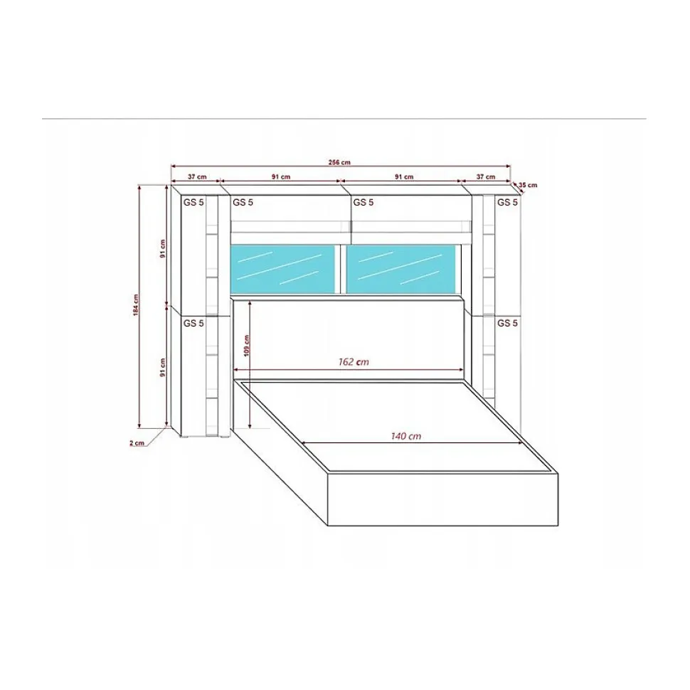 L’ensemble comprend : structure de rangement Dimensions : – Largeur : 256 cm – Hauteur : 184 cm – Profondeur : 35 cm Toutes les dimensions détaillées dans les images du produit Matériaux: – Structure en panneau de particules – Façades en MDF, feuille de finition brillant NON LAQUÉE Couleur : noir et noir brillant * Ensemble vendu sans lit * Les lumières LED ne sont pas incluses
