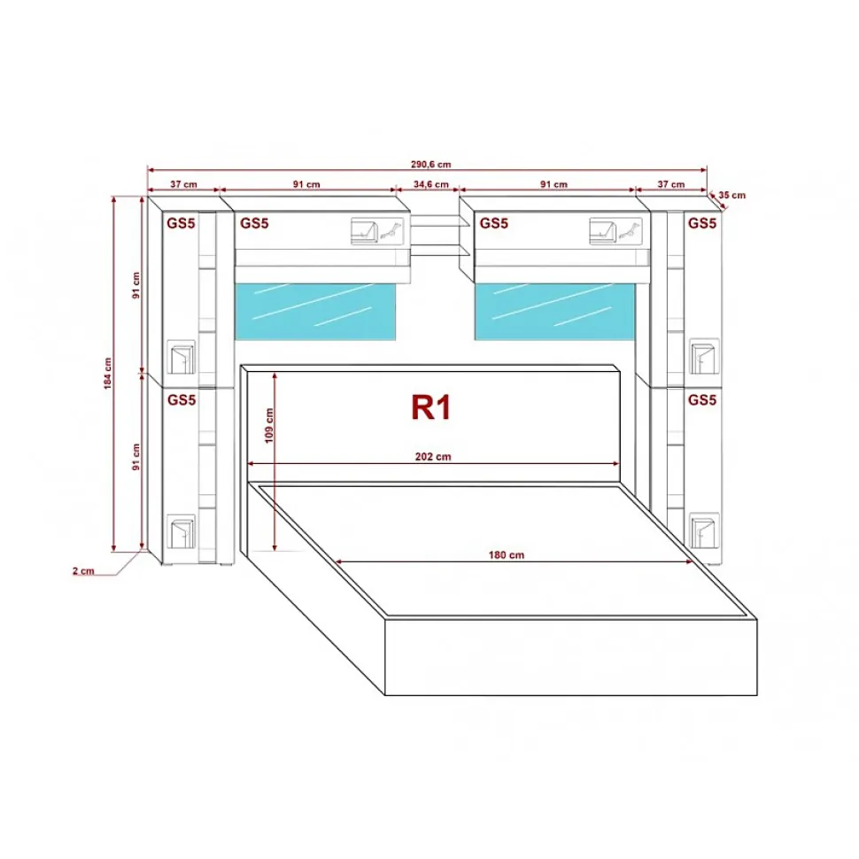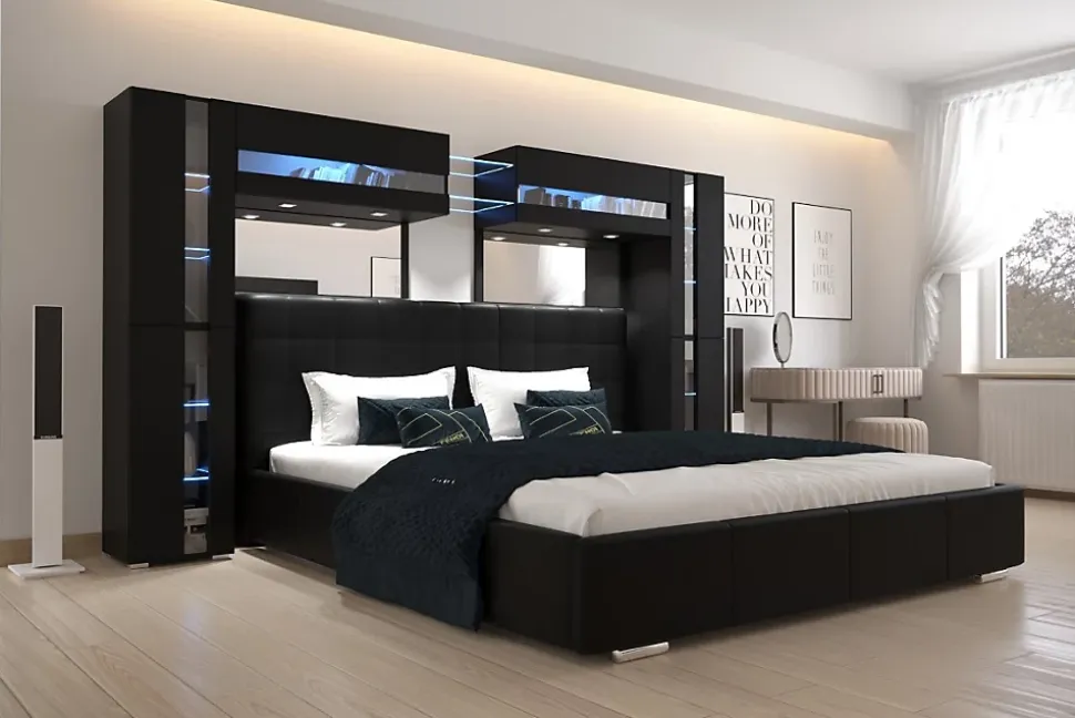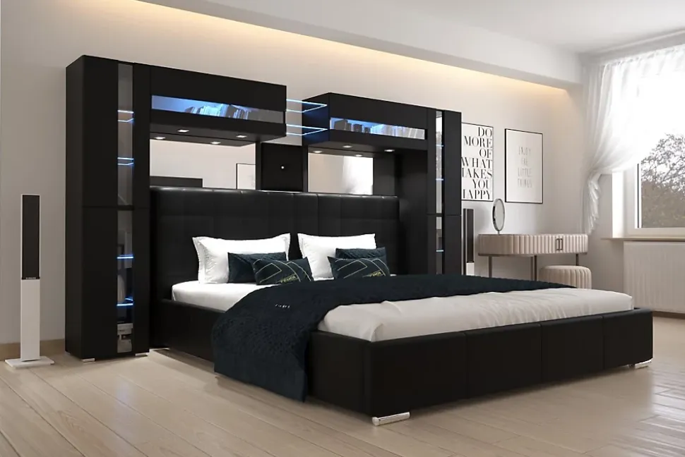 L’ensemble comprend : structure de rangement Dimensions : – Largeur : 290,6 cm – Hauteur : 184 cm – Profondeur : 35 cm Toutes les dimensions détaillées dans les images du produit Matériaux: – Structure en panneau de particules – Façades en MDF, feuille de finition brillant NON LAQUÉE Couleur : noir et noir brillant * Ensemble vendu sans lit * Les lumières LED ne sont pas incluses