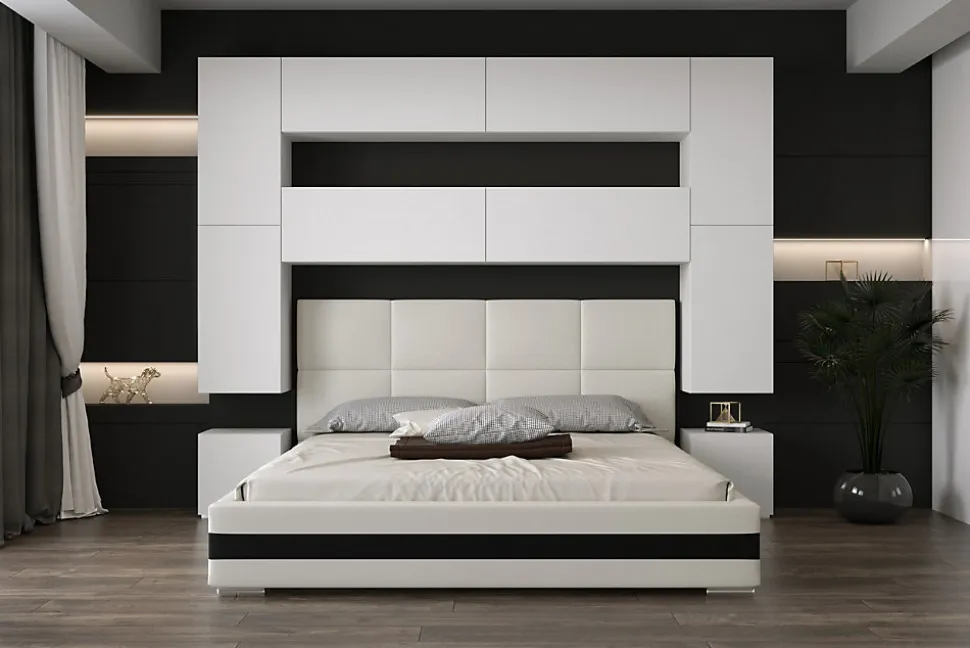 L’ensemble comprend : structure murale composée de 8 armoires. Comprend 2 tables de chevet Dimensions : – Largeur : 256 cm – Hauteur : 123 cm – Profondeur : 35 cm Toutes les dimensions détaillées dans les images du produit Matériaux: – Panneau de particules Couleur : blanc * Ensemble vendu sans lit
