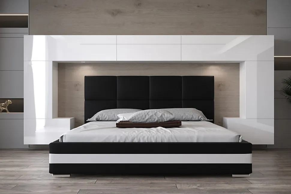 L’ensemble comprend : structure murale composée de 7 armoires de rangement Dimensions : – Largeur : 300 cm – Hauteur : 167 cm – Profondeur : 35 cm Toutes les dimensions détaillées dans les images du produit Matériaux: – Structure en panneau de particules – Façades en MDF, feuille de finition brillant NON LAQUÉE Couleur : blanc et blanc brillant * Ensemble vendu sans lit