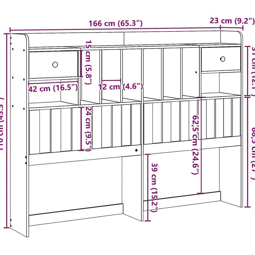 Cette tête de lit élégante donne à votre cadre de lit un aspect complet et s’adapte à n’importe quelle chambre à coucher. Cadre stable et durable : le bois de pin massif est connu pour sa résistance et sa durabilité. Ses grains droits et ses nœuds distinctifs contribuent à son charme rustique.Grand espace de rangement : la tête de lit élégante est dotée de 6 compartiments pratiques et de 2 tiroirs, offrant suffisamment d’espace de rangement pour garder tous vos essentiels de nuit à portée de main.Peu encombrant : cette tête de lit est une option peu encombrante qui peut remplacer la table de chevet, ce qui permet d’optimiser l’espace de votre chambre à coucher et la rend idéale pour les espaces restreints ou limités.Tête de lit sur pied : la tête de lit sur pied offre une solution simple pour un placement et un repositionnement sans effort, sans qu’il soit nécessaire pour l’installer au mur.Couleur : cire marronMatériau : bois de pin massifDimensions : 166 x 23 x 110 cm (l x P x H)Convient à la largeur de matelas : 160 cmAvec compartiments de rangementAvec 2 tiroirsAssemblage requis : oui
