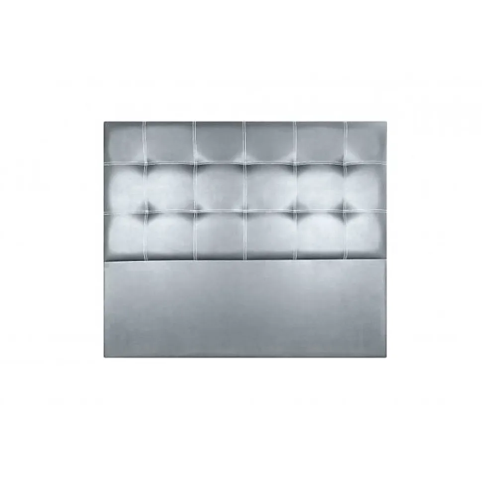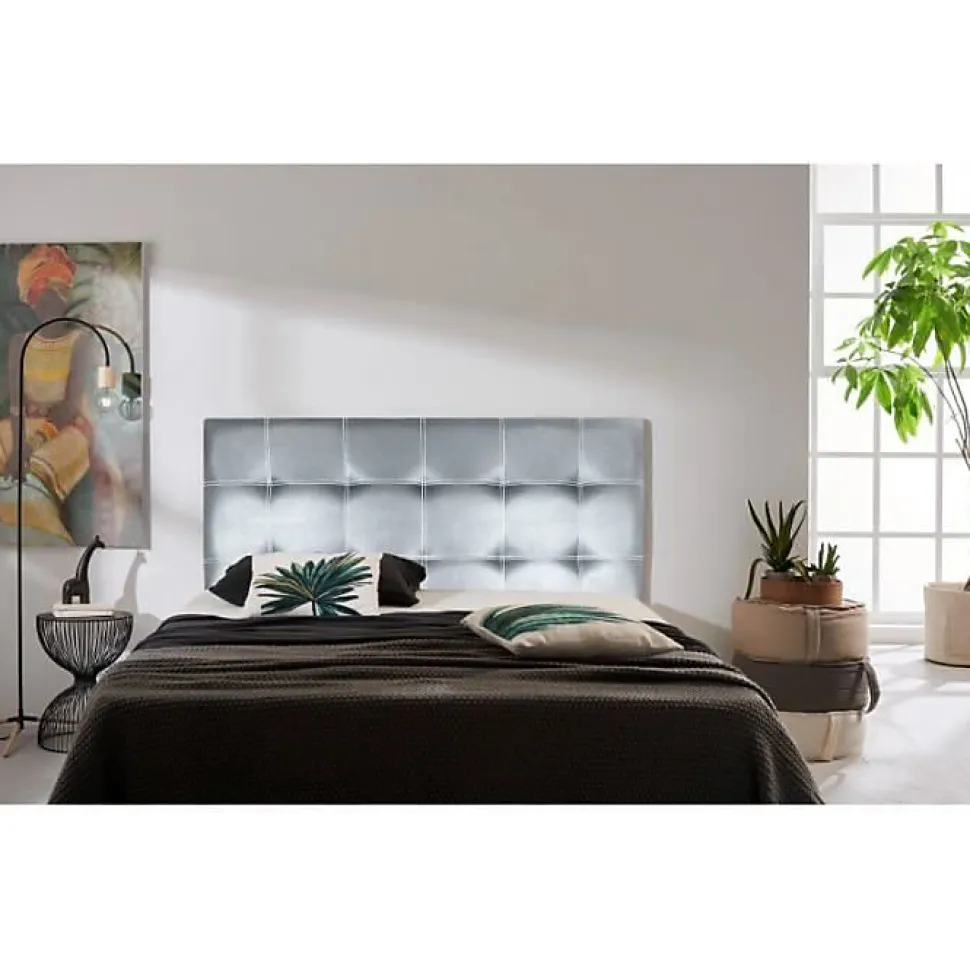 Tête de lit en similicuir Silver Iris, 130 cm de large et 120 cm de haut. Fabriquée à la main, elle allie élégance et confort grâce à son rembourrage en mousse HR. Sa structure en pin de Galice assure durabilité. Idéale pour créer une atmosphère chaleureuse dans votre chambre. Garantie 2 ans.