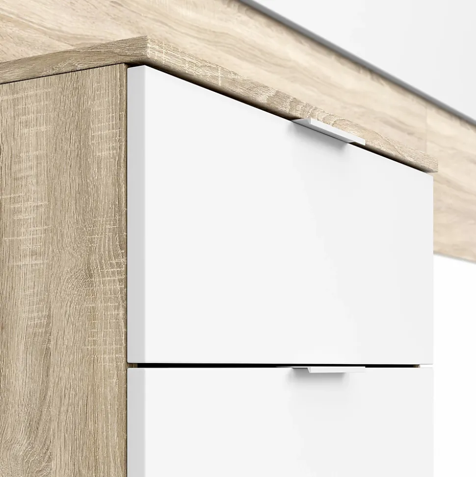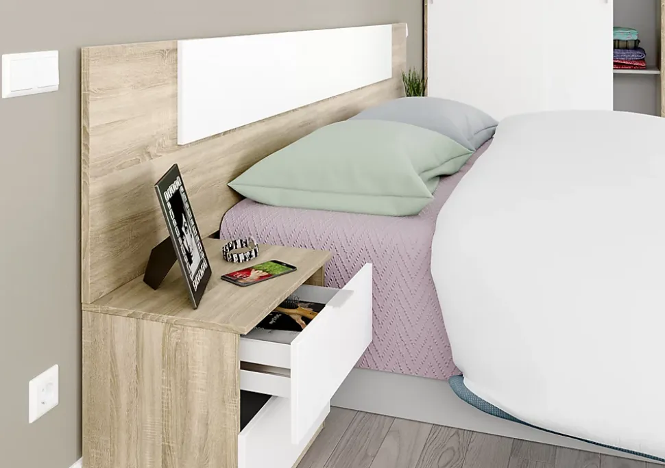 Apportez une touche moderne et chaleureuse à votre chambre avec cet ensemble composé d’une tête de lit élégante et de deux tables de chevet intégrées. L’association du blanc Artik lumineux et du chêne canadien effet bois crée un style contemporain et naturel, facile à harmoniser avec tous types de décorations.Composition : Tête de lit adapté pour lit 140 cm et 2 chevets de 2 tiroirs chacun.Dimensions de la tête de lit : H 50 x L 247 x P 3 cm Dimension de la table de chevet : H 45 x L 50 x P 38 cm . Tiroirs : H 10 x L 44 x P 30 cm. Poids maximum supporté par chaque tiroir : 5 kg. Poids maximum total supporté par le chevet : 15 kg. Couchage : 90×200 cmMatériel: Mélamine de 16 mmCouleur : chêne canadian / blanc artikPoids : 35 kgFabrication espagnole certifiée PEFCLivré en kitLivraison en RDC avec prise de RDV du lundi au vendredi