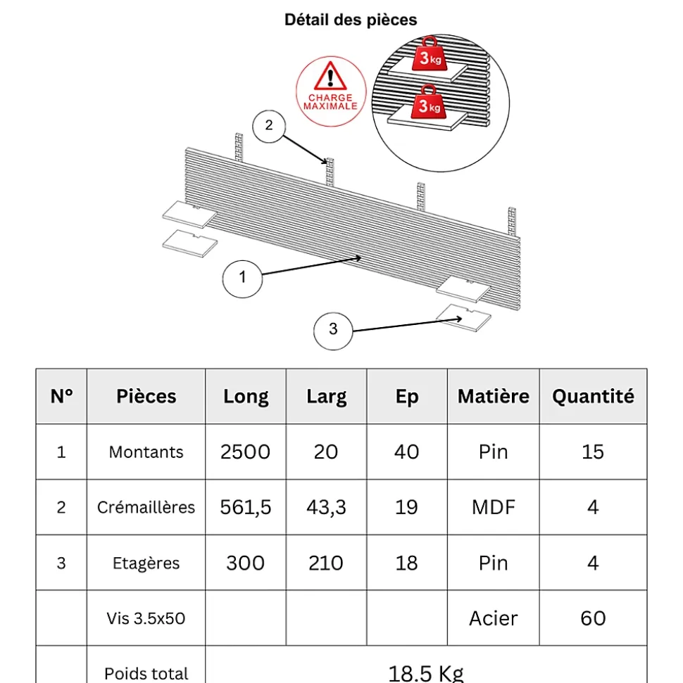 Offrez à votre chambre une touche chaleureuse et fonctionnelle avec cette tête de lit en pin, idéale pour optimiser l’espace tout en apportant un style naturel et contemporain. Conçue avec 15 tasseaux et 4 étagères amovibles, elle permet d’exposer ou ranger vos objets du quotidien : livres, réveil, plantes, téléphone…Grâce à sa largeur de 250 cm, cette tête de lit s’adapte parfaitement aux lits de 140 à 160 cm. Son design, inspiré du mobilier scandinave, en fait un élément déco aussi esthétique que pratique.Fabriquée en pin massif en France, cette tête de lit bénéficie d’un savoir-faire authentique et de matériaux de qualité pour un rendu esthétique et durable. Sa finition en en bois brut permet de la personnaliser : à peindre ou à vernir selon votre style pour l’accorder parfaitement à votre décoration. La pose se fait par fixation murale (fixations adaptées au support non fournies).Caractéristiques techniques :- Dimensions totales : Largeur 250 cm x Hauteur 56 cm x Profondeur 21 cm- Étagères (x4) : Largeur 30 cm x Profondeur 15.5 cm x Epaisseur 1.8 cm- Matières : pin (tasseaux + étagères) / MDF (crémaillères)- Poids : 20.6 kg- Charge max : 3 kg par étagère- Fixation : murale (Le type de fixation dépend du matériau du support. Choisissez vos fixations en fonction de vos murs (fixations nous fournies).- Finition : poncée (huile/vernis recommandé)*Les visuels sont présentés à titre d’illustration et n’ont pas de valeur contractuelle.