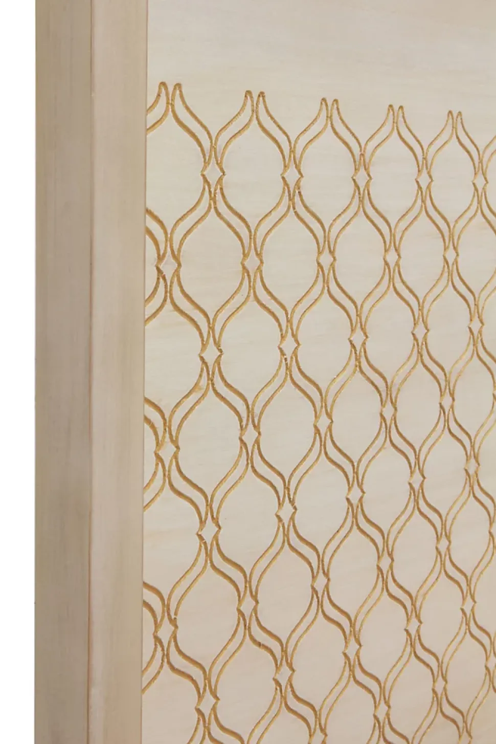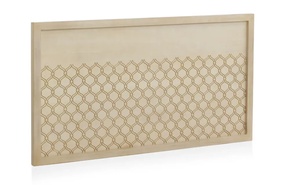 Tête de lit avec structure en panneaux plaqués chêne vanille, prête à être accrochée à l’aide de vis. Façade sculptée avec des dessins géométriques et peinte en couleur or antique.