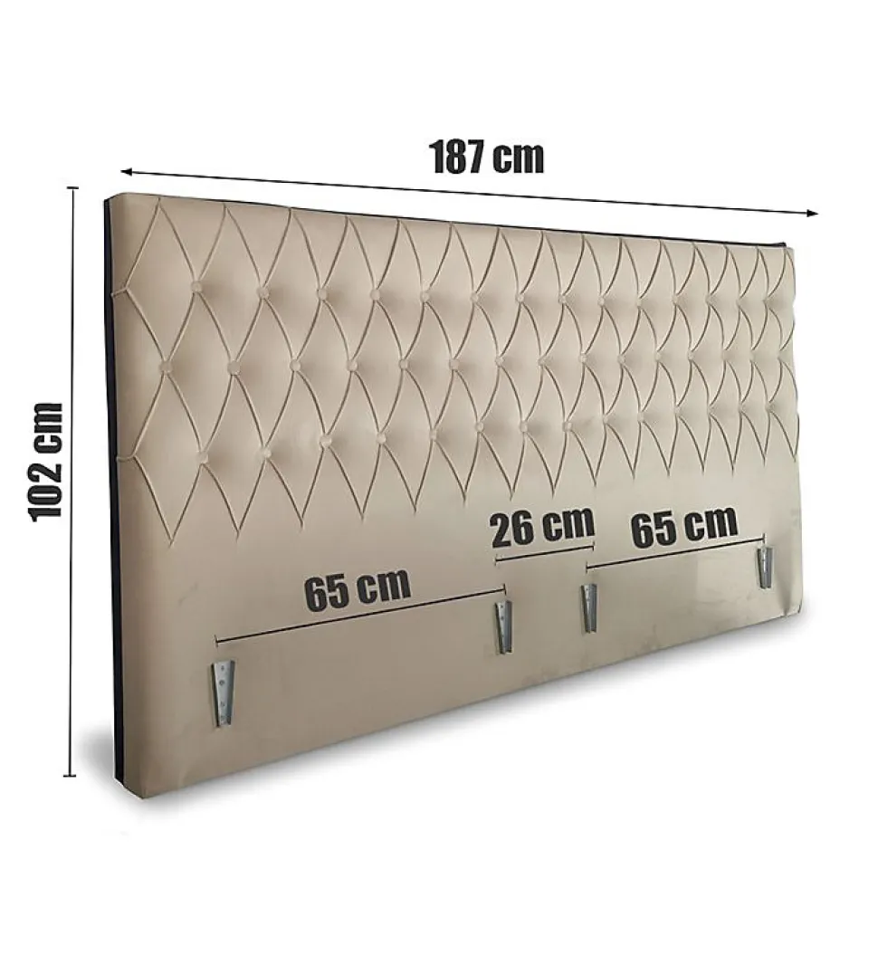 Tête de Lit en Velours Alcantara Sable ? 187 x 102 cmApportez une touche de raffinement à votre chambre avec cette élégante tête de lit en velours Alcantara couleur sable, au design capitonné et au format généreux. Ses dimensions 187 x 102 cm offrent une présence haut de gamme adaptée aux lits 160 x 200 et 180 x 200, tout en créant une atmosphère chaleureuse grâce à sa texture douce et lumineuse.Caractéristiques de la tête de lit :Dimensions : 187 x 102 cmMatière : Velours AlcantaraCouleur : Sable (beige foncé)Finition : Capiton en losangesStructure robusteFixations incluses : espacement 65 cm ? 26 cm ? 65 cmInstallation facile sur la majorité des cadres de litCompatible avec lits queen size (160) et king size (180)Points forts de cette tête de lit Alcantara :Look haut de gamme inspiré des hôtels de prestigeVelours Alcantara : doux, élégant et résistantStyle moderne et intemporelLargeur généreuse pour un rendu décoratif harmonieuxConfort visuel et tactile pour une chambre cosyUtilisation :Cette tête de lit est parfaite pour :Chambres parentalesChambres d?hôtes et hôtelsDécorations modernes, scandinaves, contemporaines ou classiquesElle transforme instantanément votre espace nuit en un lieu plus chaleureux, confortable et sophistiqué.