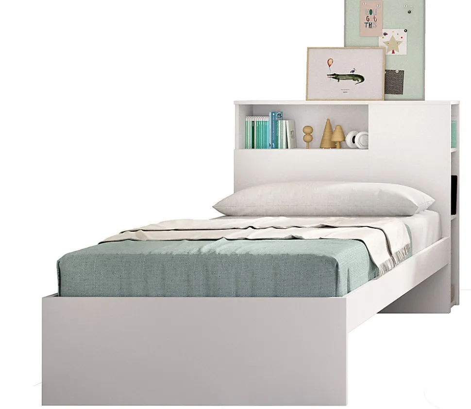 Tête de lit + structure de lit en bois coloris blanc. Le lit est doté de supports métalliques pour soutenir le sommier. Tampons en ABS antibruit et anti-rayures. Livrée en Kit. Sommier et matelas non inclus.Dimensions du lit :Longueur 218 x Profondeur 97,50 x Hauteur 95 cm Dimensions du couchage : 90 x 190 cmMatière : Bois mélaminéCouleur : blanc.Poids : 44 kg