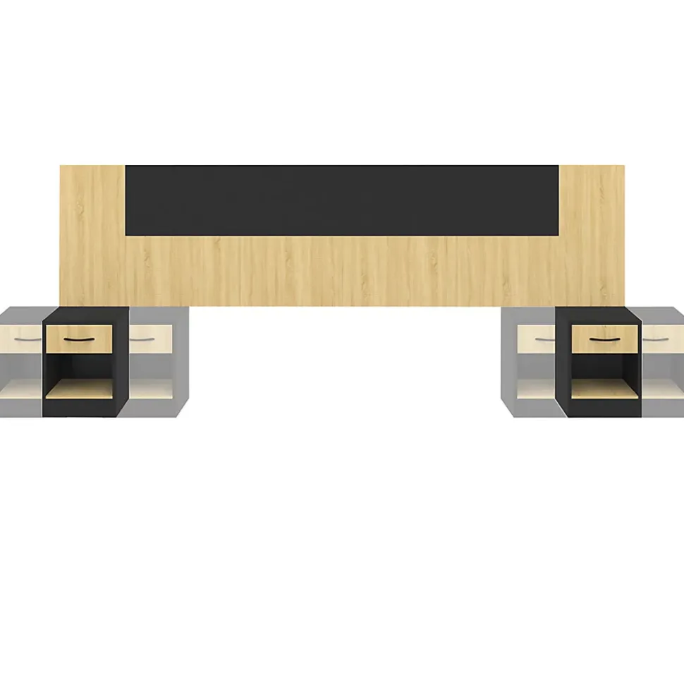 L’ensemble SAPA, composé d’une tête de lit fixe de L.240 cm et de deux chevets modulables de L.30 cm, est idéal pour votre chambre à coucher !Totalement adaptable, vous pouvez choisir la hauteur de votre tête de lit et disposer les chevets selon vos envies.La tête de lit de 240 cm de longueur se fixe directement au mur, solution pratique pour l’adapter à la hauteur de votre sommier. Chaque table de chevet est dotée d’un tiroir, parfait pour ranger vos petits objets, ainsi que d’une large niche, idéale pour poser votre livre de chevet. Utilisez le plateau supérieur pour installer votre réveil ou une lampe de chevet.N’hésitez plus et profitez dès à présent de l’ensemble tête de lit et chevets SAPA pour habiller votre chambre à coucher. Dimensions de la tête de lit SAPA bois et noirDimensions globales tête de lit : Longueur 240 cm x largeur 1,5 cm x Hauteur 60 cmDimensions bande centrale : L. 185 x H. 30 cmDimensions globales chevets : L. 30 x l. 30 x H. 39 cmDimensions façade tiroir : L. 26,5 x H. 11,5 cmDimensions intérieur tiroir : L. 22 x l. 22 x H. 6,5 cmDimensions de la niche : L. 27,5 x l. 27 x H. 17 cmHauteur pied : 8 cmMatériaux : panneaux de particulesColoris : bois / noirÀ monter soi-mêmeRetrouvez l’ensemble de nos têtes de lit sur notre boutique en ligne !