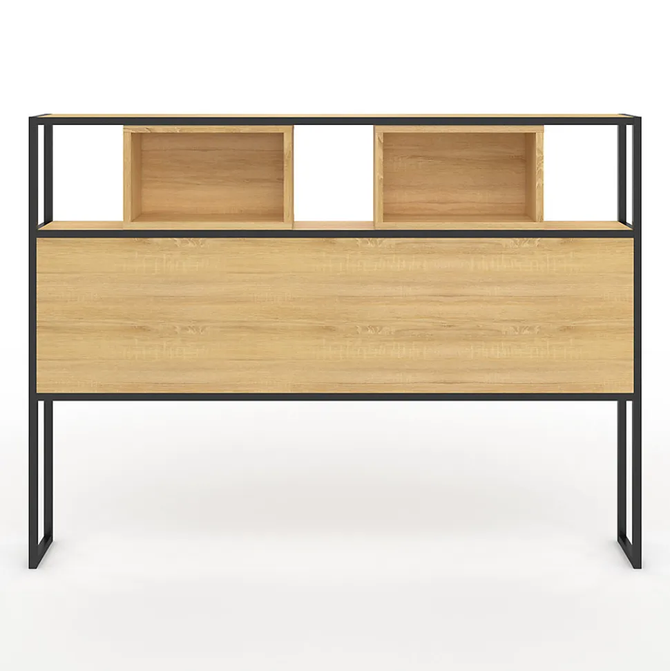 Simple et moderne, avec son design sobre et épuré, la tête de lit DETROIT s’intégrera parfaitement à votre chambre à coucher !Le contraste esthétique entre la couleur bois de la structure et le coloris noir du métal habillera joliment votre lit avec élégance et modernité.Astucieuses et fonctionnelles, ses niches supérieures et latérales vous permettront d’organiser le rangement de vos affaires personnelles pour une chambre dégagée et zen en toutes circonstances. Pratiques et déco, rangez-y votre montre, livre de chevet, réveil, pilulier, produits de nuit, sans avoir à vous relever !Stables et robustes, ses pieds contemporains en métal noir lui confèrent une allure brute esprit factory. Compatible avec les lits 160 cm, cette tête de lit ne nécessite pas de fixation murale et peut donc être installée partout et facilement, un atout supplémentaire pour cette tête de lit au style unique !Conçus pour apporter une touche de modernité aux petits comme aux plus grands espaces.Dimensions de la tête de lit DETROIT- Dimensions totales hors tout : Longueur 163 CM x largeur 18 CM x Hauteur 120 CM- Dimensions des 2 niches supérieurs : Longueur 37 x Profondeur 18 x Hauteur 24.5 CM- Dimensions des niches latérales : Longueur 16 x Profondeur 25 x Hauteur 41 CM- Hauteur par rapport au sol : 45 CMRetrouvez également le format pour lit 140 CM ainsi que l’ensemble de notre collection industrielle sur notre boutique en ligne.
