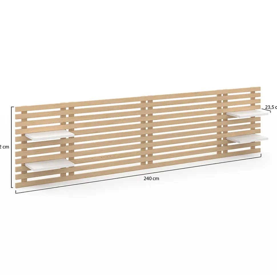 Craquez pour le look moderne de la tête de lit AVA au design bicolore effet bois clair et blanc. Cette tête de lit de 240 cm de long habillera votre mur et apportera une touche cossue et design à votre lit.Adaptable à tous les lits 140 cm et 160 cm, la tête de lit AVA est facile à installer. Grâce à son design fin et ses accroches murales, elle permet également un gain de place dans votre chambre à coucher.La tête de lit AVA est également composée de 4 tablettes de chevet blanches modulables que vous pouvez placer à la hauteur qui vous convient le mieux. Vous pourrez ainsi y déposer vos affaires personnelles, nécessaire de nuit, réveil ou encore lampes de chevet.Sa hauteur de 62 cm vous permet de vous adosser confortablement avec vos oreillers pour lire ou regarder votre série préférée. Pour un effet encore plus cocooning dans votre chambre, choisissez d’entrelacer une guirlande lumineuse sur le haut de votre tête de lit et profitez ainsi d’une ambiance chaleureuse toute la soirée. Dimensions de la tête de lit lattes AVA en bois clair et étagères blanchesDimensions globales : Longueur 240 cm x largeur 23,5 cm x Hauteur 62 cmDimensions d’une étagère : L.32,5 x l.20,5 x H.1,8 cmMatériaux : Panneaux de particules revêtement mélaminéColoris : Bois clair et étagères blanchesEspace entre chaque latte : 2 cmLongueur centrale entre les étagères : 160 cmKit de fixation inclusÀ monter soi-mêmeRetrouvez également nos autres têtes de lit disponibles sur notre boutique en ligne.